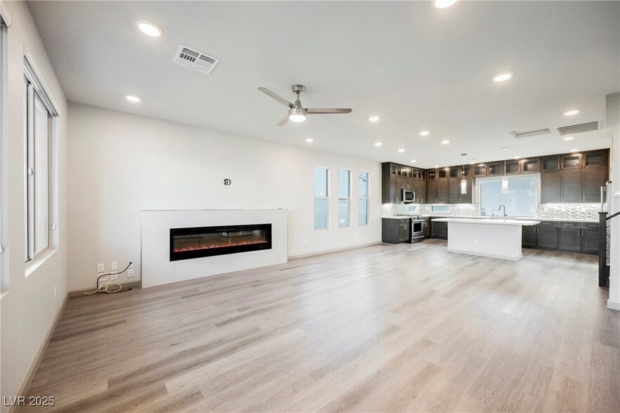 Modern 3-story home with rooftop deck and mountain views! The first floor includes a private bedroom, 3 4 bath, and laundry area ideal for guests or a home office. The second floor features the primary suite with dual sinks and walk-in closet, plus an additional bedroom and a spacious flex/living area. Upstairs, the third floor offers an open-concept great room with high ceilings, wood-look flooring, cozy fireplace, and balcony access. The chef s kitchen shines with quartz counters, shaker cabinets, stainless steel appliances, mosaic backsplash, pendant lighting, walk-in pantry, and island with breakfast bar. Enjoy morning coffee on the balcony or take in the mountain views from the rooftop deck. Low-maintenance yard, paver patio, and two-car garage complete this stylish rental ready for immediate move-in!