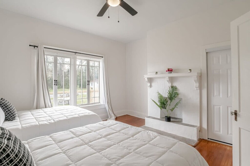 Full of character with coffered ceilings, stunning hardwood floors, and abundant natural light, this modernized charmer comfortably accommodates twelve guests in its 3-bedroom, 2-bathroom layout. Perfect for a convenient and reliable stay, this home is just two miles from downtown and the Mobile Cruise Terminal. The photos feature both professional shots and real-time images from the cleaning team, so you know exactly what to expect. Guests will enter through the front door by using a digital keypad. After entering, you will immediately notice the beautiful hardwood floors and natural light throughout the home. Off the left and right sides of the entryway are two living rooms. The living room to the left has a couch, a loveseat, and a SmartTV. The living room to the right has a couch, sofa, and small desk with a chair. Through this living room is an additional sitting room with two armchairs. Straight through the door in the living room takes you to the hallway with the bedrooms, bathrooms, dining room, and kitchen. The first door to your left is a bedroom with two full beds and a decorative fireplace. The first door on the right is the second bedroom with a king and full bed. Continue down the hallway; the next door on the right is the first full bathroom with a shower/tub combination. The next door on the right is the master bedroom. Here you will find a queen bed, a full bed, a SmartTV, and an en-suite bathroom with a shower/tub combination. Across from the bathroom is the dining room. The beautiful farm table comfortably seats eight guests. Through the dining room is the fully equipped kitchen with stainless steel appliances, ample space, and cookware essentials. The laundry room is at the end of the hall and provides access to the backyard. Out back is a small patio with a grill. Off-street parking is on the half circle in front of the home and the parking pad is in the back. A pack 'n play/travel crib is available upon request. Pets are welcome with a non-refundable fee. A pack 'n play/travel crib is available upon request. The home is on the corner lot of a busy street. Off-street parking is available in the front and back of the home. Only two miles to downtown and the cruise terminal! Uber, Lyft, and other taxi services are available, but driving is encouraged. The home offers contact-free check-in via a digital door code. Quiet hours are between 10 PM and 7 AM. If quiet hours are violated and neighbors are disturbed, the reservation may be canceled, requiring immediate departure without a refund. Smoking is prohibited, and any signs of smoking will incur a $500 damage charge. Parties are not allowed, and any damage to the home or its furnishings during your stay will be your responsibility. Trash must be bagged and placed in the bins provided, with a $100 charge for third-party trash removal if excessive trash is left. Pets must be crated when left unattended, are not allowed on furniture or beds, and all waste must be cleaned up from the yard. Evidence of pet hair on furniture, excess hair in the home, stains, or waste will result in cleaning charges. [SI]