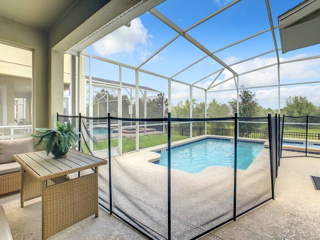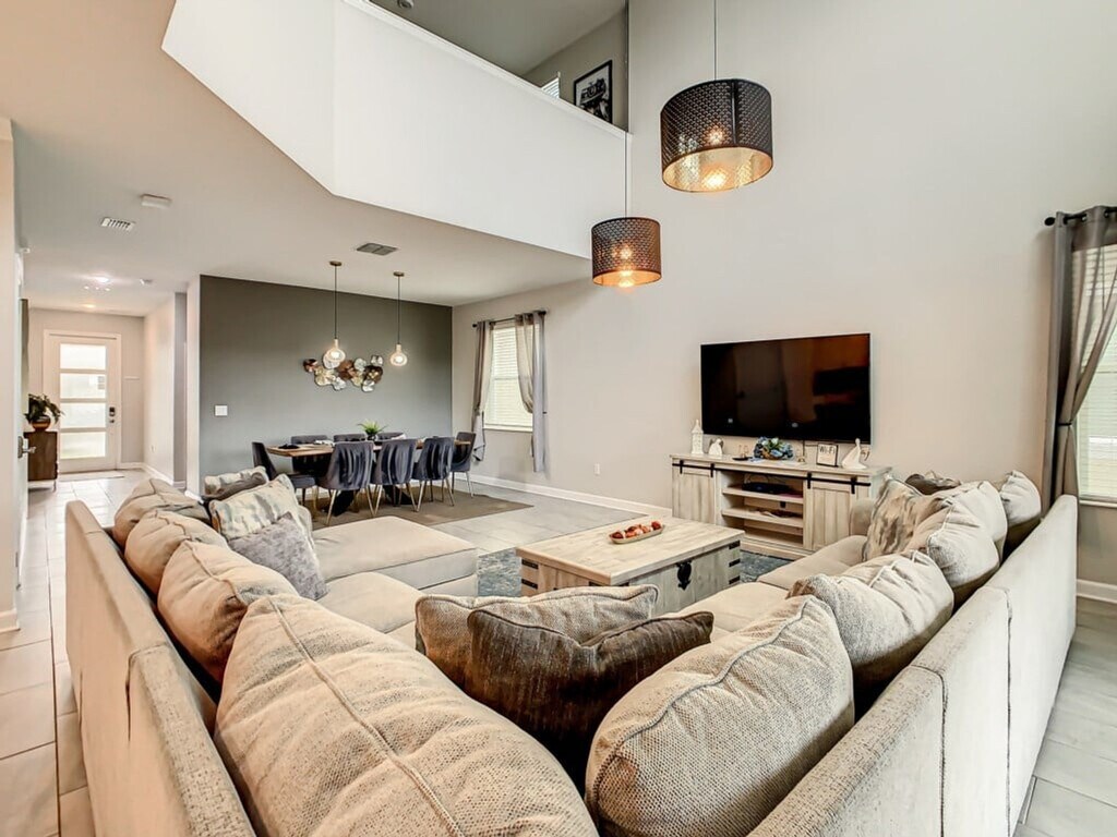 Welcome to Cabot Cliff Memories, a luxurious 5-bedroom, 5-bath villa located in the world-renowned Champions Gate Golf Community. With room for 10 guests, this sunlit home offers themed bedrooms, a private pool and spa, and a fully equipped kitchen. Enjoy the nearby major theme parks, including Disney just 20 minutes away, or relax at the Oasis Clubhouse with its lazy river, fitness center, and tiki bar. Perfect for families and groups, your unforgettable vacation starts here! Relax in the spacious living room with a large sectional, perfect for family time. The open-plan layout includes an 8-seat dining table and a 4-seat breakfast bar, ideal for group meals or midnight snacks. The kitchen is fully equipped with modern appliances, a large island, and all the tools needed to prepare delicious meals during your stay. The upstairs loft offers a sectional couch and a large flat-screen TV, perfect for movie nights or binge-watching your favorite shows. Step outside to your private screened pool and spillover spa, complete with outdoor furniture and lounge chairs. Optional pool heating is available for an additional fee. Driveway parking is available for 1 car. Located just 20 minutes from Disney and close to Universal Studios, SeaWorld, and other attractions. Champions Gate also offers local dining, shopping, and entertainment options. No pets, parties, or outside visitors allowed. Check-in is at 4 PM and check-out is at 10 AM. Driveway parking is available for 1 car and there is no street parking. As a guest of the Champions Gate community, enjoy access to the Oasis Clubhouse, featuring a resort-style pool, lazy river, splash park, tiki bar, fitness center, and even a movie theater. Golf enthusiasts will love the two Greg Norman-designed golf courses. [SI]