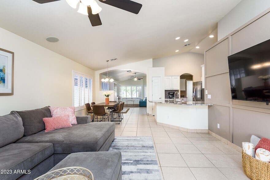 LOCATION!! FULLY FURNISHED home in the desirable neighborhood of Fletcher Heights, with 4 bedrooms, 2 bathrooms, Sleeps 7-8. Convenient location by the 101, Peoria Sports Complex, Glendale Stadium, Casino, Arrowhead shopping, dining, entertainment, and hospitals! Inside is upgraded with plantation shutters, granite countertops, white cabinetry, a beautiful formal sitting area, and comfortable living room with 70' TV. The backyard is perfect for Arizona mornings and evenings with rolling sunshade and turf. This cozy cul-de-sac lot offers park views with a walking/bike path.