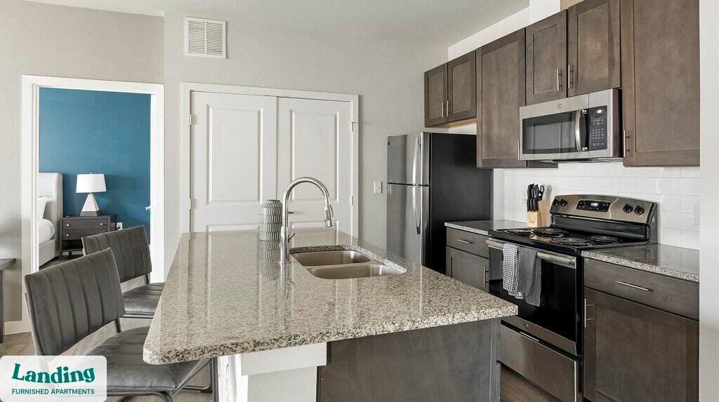 Landing offers flexible lease terms from weeks to months. Please always visit our website or contact us for the latest pricing & availability. Stay longer, save more: 6-Month Minimum base rent: starts at $1905/mo 12-Month Minimum base rent: starts at $1664/mo Landing offers flexible leases across a network of over 35,000 fully-furnished apartments throughout 375+ cities so you can rent on your terms, practically anywhere, and avoid the hassle of paying deposits or application fees. Visit to learn about all the benefits of a Landing membership, see our competitive up-to-date pricing, explore available apartments, take virtual tours, and make reservations online without jumping through traditional rental hoops. Landing's apartments at Clark Ridge Canyon are designed for comfortable, easy living, with the ability to stay as long as you like. Experience living with Landing Every apartment is outfitted with all the modern essentials including: custom-designed furnishings, a fully-equipped kitchen with deluxe stainless steel appliances, a gourmet coffee maker, premium linens, Smart TVs, and incredibly fast, reliable internet for working from home. When you live with Landing, you'll enjoy a hassle-free experience with the added benefit of 24/7 access to our dedicated member experience team. Some of the nitty-gritty: a background check and proof of income are required; we're completely smoke-free; bundled utility packages and pricing vary based on length of stay; pet-friendly options available; listed price reflects a 12-month minimum stay.