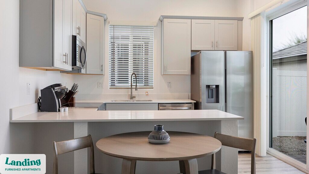 Landing offers flexible lease terms from weeks to months. Please always visit our website or contact us for the latest pricing & availability. Stay longer, save more: 6-Month Minimum base rent: starts at $1795/mo 12-Month Minimum base rent: starts at $1656/mo Landing offers flexible leases across a network of over 35,000 fully-furnished apartments throughout 375+ cities so you can rent on your terms, practically anywhere, and avoid the hassle of paying deposits or application fees. Visit to learn about all the benefits of a Landing membership, see our competitive up-to-date pricing, explore available apartments, take virtual tours, and make reservations online without jumping through traditional rental hoops. Landing's apartments at Zora Encanto are designed for comfortable, easy living, with the ability to stay as long as you like. Experience living with Landing Every apartment is outfitted with all the modern essentials including: custom-designed furnishings, a fully-equipped kitchen with deluxe stainless steel appliances, a gourmet coffee maker, premium linens, Smart TVs, and incredibly fast, reliable internet for working from home. When you live with Landing, you'll enjoy a hassle-free experience with the added benefit of 24/7 access to our dedicated member experience team. Some of the nitty-gritty: a background check and proof of income are required; we're completely smoke-free; bundled utility packages and pricing vary based on length of stay; pet-friendly options available; listed price reflects a 12-month minimum stay.