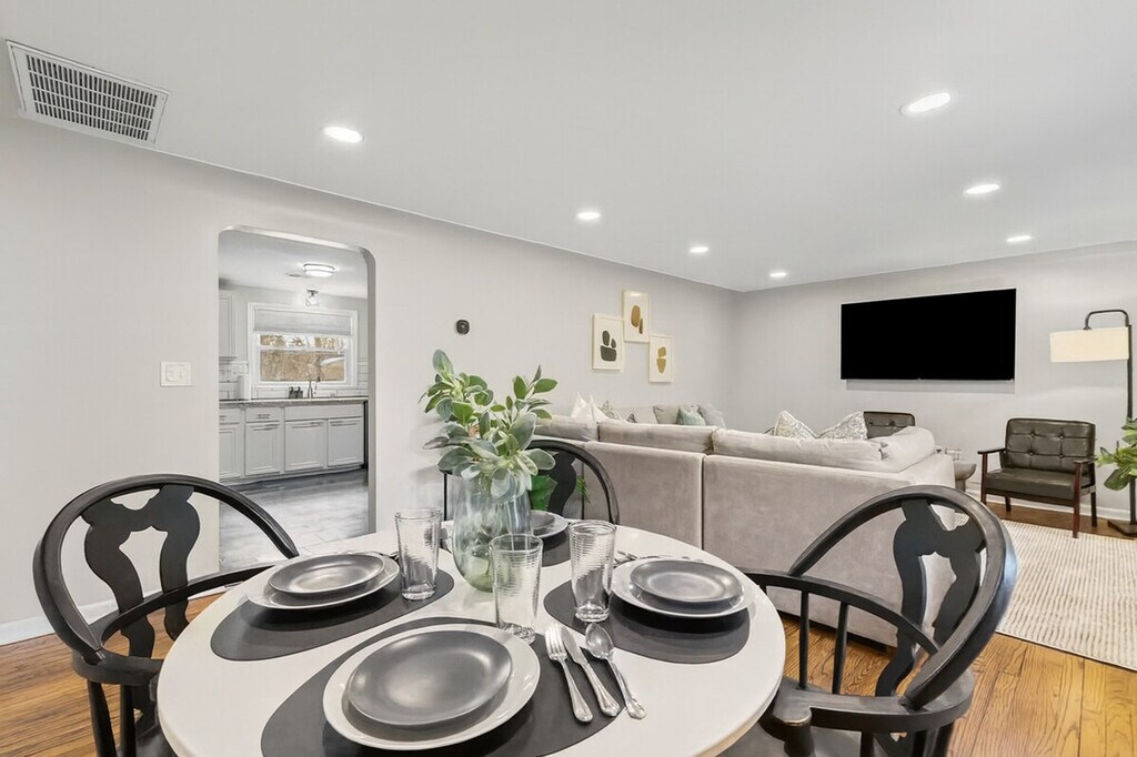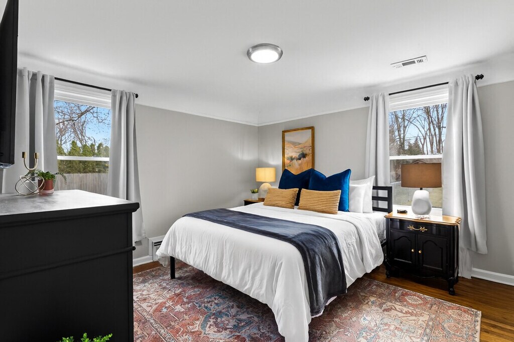 Relax and enjoy this spacious and comfy apartment flat, situated in a serene location in Shelby Township. This relaxing retreat is perfect for your visit, whether you're traveling for work or vacation. The apartment features two comfy bedrooms with queen-size beds, a fenced backyard, a fully equipped kitchen, a shared fire pit, a smart TV, and high-speed Wi-Fi. A blend of comfort, style, and convenience greets you as soon as you step inside. The living area is the home's heartbeat, with a lively living room leading into the fully equipped kitchen and its charming dining area. Large windows and balcony doors allow for plenty of natural light to illuminate the space throughout the day, creating a feeling of pure warmth. Comfortable bedrooms are designed to offer all the rest you need after a long day of work. Finally, take a stroll around the lush green yard to catch some fresh air and clear your head. This pet-friendly unit charges a $150 fee per pet. Non-approved pets will incur a $500 fine, and failure to disclose pets may result in the cancellation of your booking without a refund. A 3% charge applies for processing payments and an additional 3% charge for refunding payments. The home is nestled in a serene, family-friendly neighborhood in Shelby Township, MI. It offers a safe escape from the big city crowds while being just a few steps away from the bustling avenue, full of restaurants, shops, bars, and attractions. Business travelers will enjoy the proximity of major employers and transportation options, making your commute less of a hassle. Vacationers will enjoy the calm and serene location, surrounded by trees and greenery. Popular places of interest include Van Dyke Avenue, Detroit Zoo, Lake Saint Clair Metropark, Detroit Institute of Arts, Motown Museum, Downtown Detroit, and Belle Isle. Check-out time is 11 AM, and a $250 fee will be charged if you check out after 11:15 AM. Quiet hours are from 9 PM to 8 AM daily, with a $250 fine for noise complaints. Please do not move furniture, as a $250 fine applies if furniture is moved from its original position. An excessive cleaning fee of up to $250 may apply for dirt, mud, or stains on floors or rugs. Smoking is only allowed outside, with a $1000 fine for smoking inside the unit. Dispose of all smoking waste in the green dumpster, and a $250 fine will be charged if debris is left behind after your stay. The home is part of an attractive brick duplex, sharing the laundry room and backyard with guests in the other part of the duplex. Long-term bookings may require a signed lease for stays of 28 days or more. Security devices are present surrounding the entire exterior of the home, but there are no video cameras or recording devices inside the home. The living room includes a comfortable sofa with pillows, a dining table with seating for four, a 55” smart TV, comfy leather chairs, a coffee table, and reading lights. Feel free to use the office desk if you need to attend to business. High-speed Wi-Fi is available throughout the apartment. [SI]