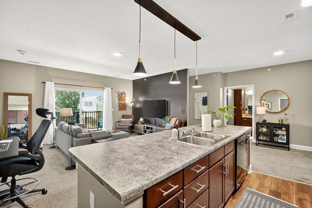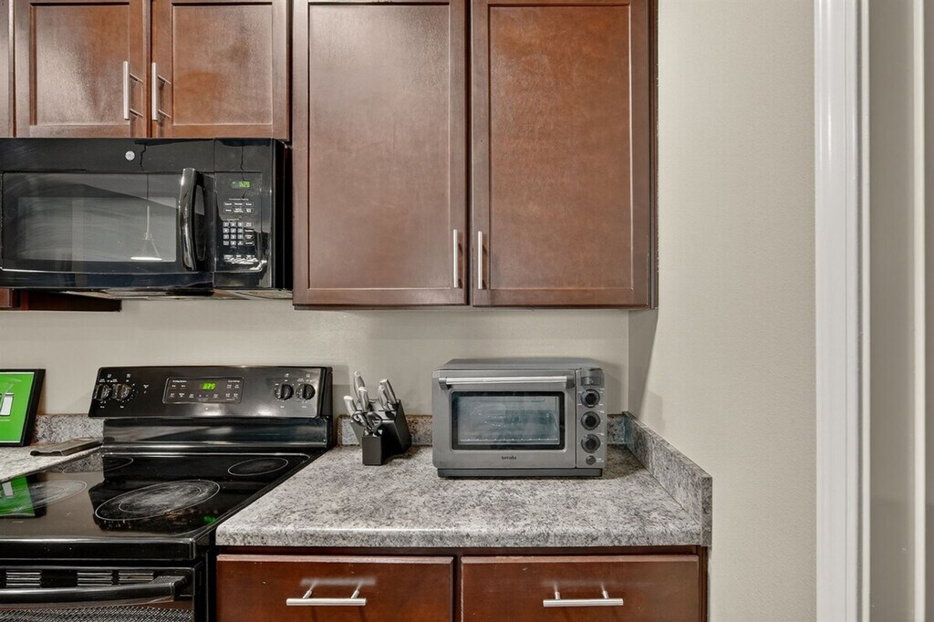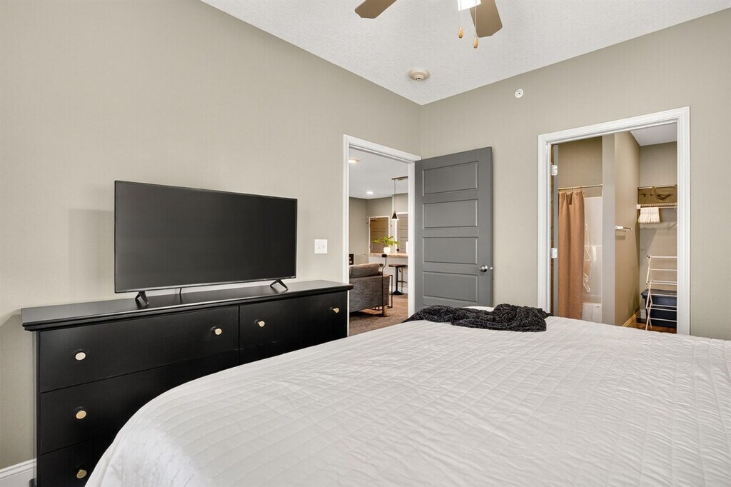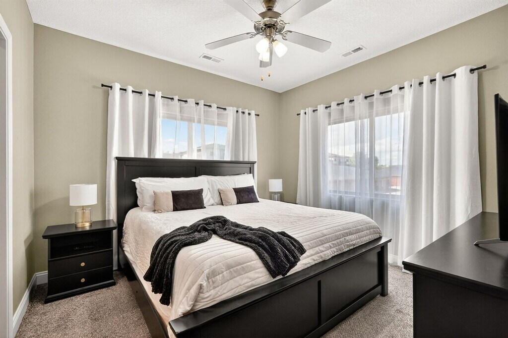 Discover "Matteo", a stylish modern retreat designed for comfort and convenience. The open living space features a plush sofa, designer leather accent chairs, and a huge 65" smart TV, flowing seamlessly to a private balcony. A fully equipped kitchen with modern appliances makes dining in easy, while the two bedrooms offer ultra-plush king-size beds, room-darkening curtains, smart TV, and more. Enjoy the rare perk of a private, attached garage for a perfectly secure and hassle-free stay. Welcome to Matteo, a modern condo-inspired retreat blending sleek design with thoughtful comfort. Step inside and be greeted by an open-concept living area featuring a plush sofa, designer leather accent chairs, and a bold black accent wall. The centerpiece is a 65” smart TV with full surround sound, perfect for movie nights or streaming your favorite shows. Floor-to-ceiling windows bring in natural light and open to an expansive private balcony, where you can enjoy morning coffee or evening drinks while overlooking the pool in the distance. The kitchen is designed for both everyday convenience and entertaining, boasting a huge island with seating, modern appliances, and plenty of counter space. Whether you’re cooking a full dinner or ordering takeout, the kitchen is stocked with everything you need. Designer touches such as upgraded lighting fixtures, curated décor, and clean modern finishes are carried throughout the space, creating a stylish yet comfortable atmosphere. Two spacious bedrooms each feature king-size beds, smart TVs, and room-darkening curtains for a restful night’s sleep. Thoughtful design ensures a cozy yet elevated experience, whether you’re unwinding after a day out or working remotely. The two bathrooms offer large vanities with ample storage, updated fixtures, and modern accents. Shampoo, body wash, conditioner, body towels, hand towels, and washcloths are provided. An added bonus: hair wraps, make-up towels, and a hair dryer with attachments. You'll love having a dedicated laundry room with a washer and dryer, making longer stays seamless and stress-free, with laundry supplies included such as an iron, ironing board, drying rack, and more. You will have full access to the unit, private garage, and the clubhouse which includes the fitness center, tanning bed, and swimming pool. Appreciate the convenience of a private garage space attached to the building providing security and ease for your stay. Combined with the property's location and thoughtful upgrades, Matteo is ideal for business travelers, couples, or families seeking comfort, style, and function. Stay here and enjoy a space where modern design meets practical living. If this unit is not available for the dates you need, check out other listings for available units within the same community.