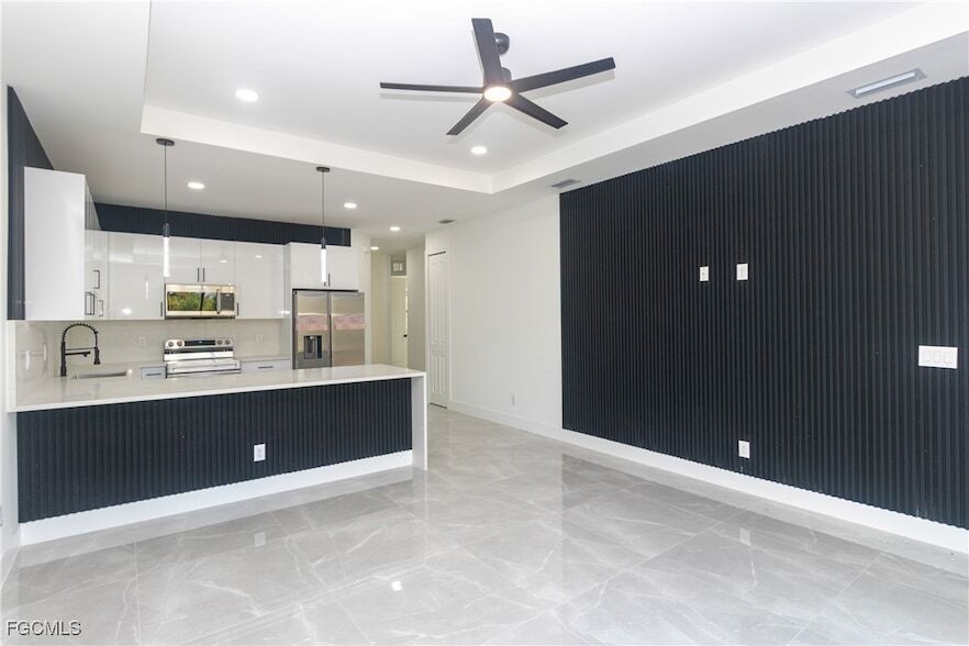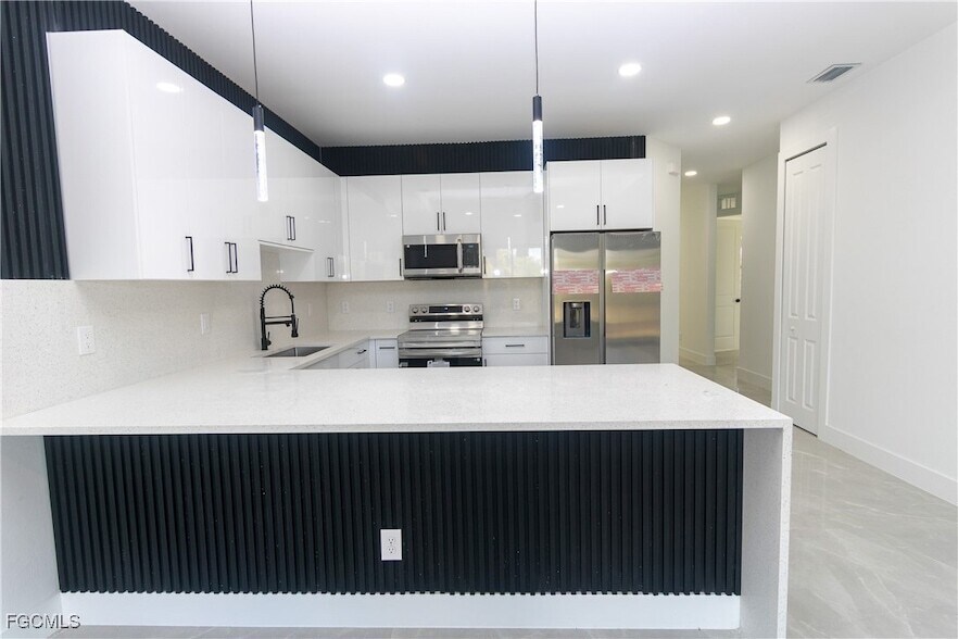 Brand New Construction Duplex in Lehigh Acres! This modern masterpiece features 3 bedrooms and 2 bathrooms, blending high-end aesthetics with functional design. The stunning gourmet kitchen boasts white quartz waterfall countertops, high-gloss cabinetry, and premium stainless steel appliances. Enjoy an open-concept layout with large-format porcelain tile throughout! The spa-inspired bathrooms feature floor-to-ceiling marble-look tile, frameless glass showers, and matte black designer fixtures. Sleek curb appeal with charcoal garage doors, tropical landscaping, and a monochromatic finish. Washer hook-ups in garage. Schedule your showing today!