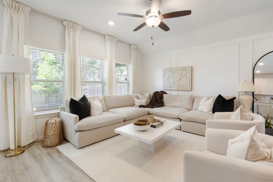 Nestled in a charming neighborhood, this delightful home offers 3 bedrooms, 2 bathrooms, and a private spacious backyard with no neighbors behind perfect for privacy and entertaining. Save on electricity with solar panels and enjoy the use of whole home water softener. The open concept floor plan allows for seamless flow between the kitchen, dining, and living areas. Upgrades include stainless steel appliances, detailed trim work, hardwood floors, and a cozy fireplace. Home comes unfurnished but the photos show how beautiful it can be furnished. Enjoy the convenience of nearby parks, schools, and shopping centers. Don't miss out on this fantastic opportunity to rent a piece of paradise in a sought-after location. The Woodlands Hills is a 2,000-acre forested master planned community, featuring 112 acres of open space, 20 neighborhood parks, a 17-acre Village Park and an activity center with event space and fitness facility. 3D tour is of the model floor plan.