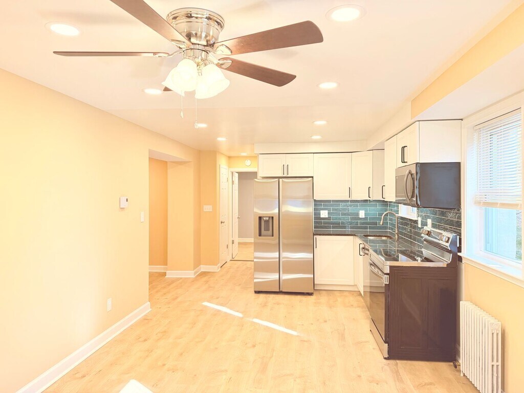 This completely renovated 1-bedroom apartment is located in a small, 5-unit garden-style brick building on a quiet street in Takoma Park. The home is on the ground floor and gets excellent natural light – the living room especially enjoys direct sunlight even on overcast days. Apartment Features Brand-new, designer kitchen with: White shaker cabinets & modern black hardware Deep emerald subway tile backsplash Granite countertops with L-shaped workspace Stainless steel appliances: side-by-side fridge with water/ice, smooth-top range, microwave, and dishwasher Recessed lighting and a ceiling fan Bright open living/dining area with large windows and beautiful wood-look laminate flooring throughout Spacious bedroom with a huge walk-in closet that has its own window – large enough to use as a bonus office space while still leaving room for an open closet or storage on the opposite wall Additional dining room pantry and linen closet for extra storage Renovated bathroom with classic white tile and stylish black-and-white mosaic floor Ceiling fans in the living room, kitchen, and bedroom Newer high-efficiency vinyl windows Radiator heat; window A/C units are provided free of charge Building & Amenities Quiet, well-kept 5-unit brick building Coin-operated laundry on the same level as the apartment – right across the hallway from your door Extra storage bay included at no additional cost Square footage is approximate Max occupancy: 2 persons Utilities & Lease Terms Tenant pays all utilities Electric & gas are individually metered Water/sewer & hot water billed via RUBS (Ratio Utility Billing System) Pets welcome! (pet fee applies) Requirements: 1-year lease, 1 month security deposit, good credit (650+ FICO) We can show the apartment any day except Saturday Location About 1.5 miles to Takoma Metro; RideOn bus and UM Shuttle stop are right around the block Short walk to shopping, Sligo Creek Parkway, Long Branch Parkway, and bus lines Minutes to I-495 Beltway and the vibrant downtown Silver Spring area This is a move-in-ready, beautifully updated apartment in a quiet, convenient Takoma Park location.