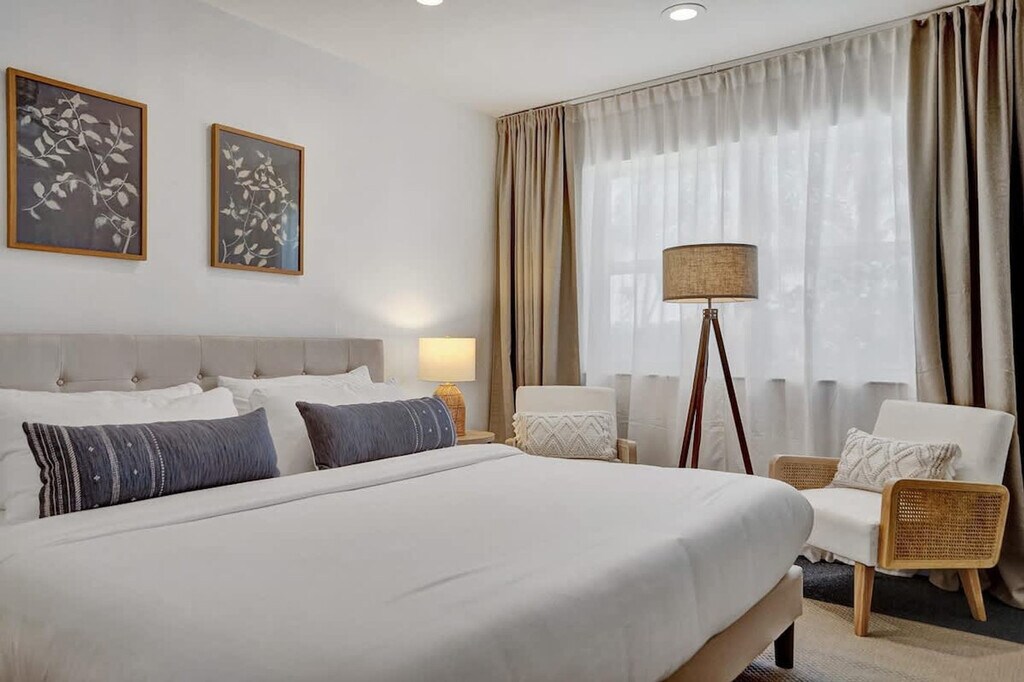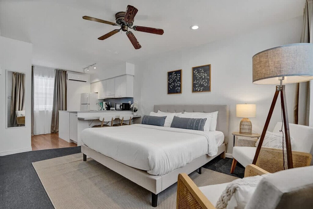 Welcome to your retreat at Marine Villas Hollywood, a newly renovated studio apartment perfect for a relaxing getaway. This spacious studio features a king-size bed and a cozy sitting area, ideal for unwinding with a good book. The fully equipped kitchen includes a Keurig coffee machine for your morning brew. Enjoy the convenience of an on-site laundry room and explore the outdoors with our garden BBQ, bikes for boardwalk rides, and even surfboards for the adventurous. Each apartment is equipped with a smart TV for entertainment on those rare rainy days. The maximum occupancy for the studio is two persons, and only registered guests are allowed to stay overnight. Quiet hours on Hollywood Beach are from 11:00 p.m. to 8:00 a.m. A $250 fee will be charged for smoking in the rooms, and smoking is only permitted outside if it does not disturb other guests. A cleaning charge of at least $100 may apply if the apartment is damaged or left excessively dirty. Please clean the grill after use to avoid a $25 cleaning charge. Pets are not accepted, and a minimum $100 pet cleaning fee may be charged if a pet is found in the room. Service dogs are welcome but must be with you at all times. Only one parking spot is allowed per apartment, with an optional $20 charge for extended parking after checkout, subject to availability.