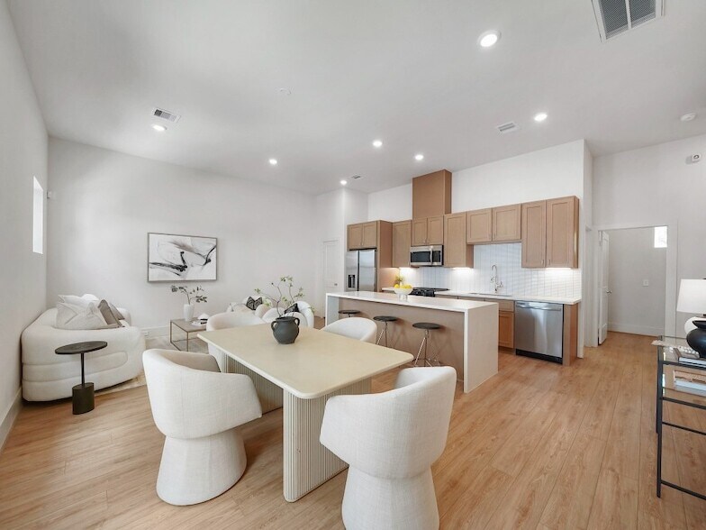 Stunning 3-story new construction home in a private gated community featuring 3 bedrooms and 3.5 baths. Enjoy engineered wood floors and high ceilings throughout. The second floor offers an open-concept living space with a chef s kitchen complete with waterfall island, quartz countertops, gas range, stainless steel appliances, and under-cabinet lighting. The third floor features a spacious primary suite with vaulted ceilings and a spa-like bath with dual sinks, soaking tub, glass shower, and large walk-in closet. Each secondary bedroom includes its own ensuite bath. Rare for the area, the home also offers a private, fully fenced backyard.