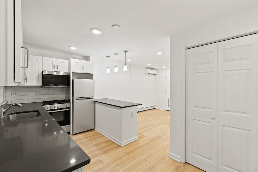 The apartment's open design offers a fluid layout for social entertainment to the dining experience, with abundant sunshine through the oversized windows. The new construction apartment includes stainless steel appliances with a refrigerator, dishwasher, microwave, and range. The mini-split heating and cooling controls allow you to control each room's temperature for the perfect settings. The large pantry in the kitchen allows for plenty of storage. The entry has a large coat closet. The hardwood floors throughout and the pristine bathroom offer comfort in a private setting. The apartment includes a washer/dryer combo. The tenant will have access to a shared backyard for summer barbeques or just relaxing in the spring or summer air. The apartment is conveniently located 1/2 mile from Journal Square Path and all Journal Square's convenient shopping. Whether you prefer the bus or path, it will get you where you need to go. Twenty minutes to the World Trade Center, 35 minutes to Port Authority, or get on 78 if you need to go north or south within five minutes.