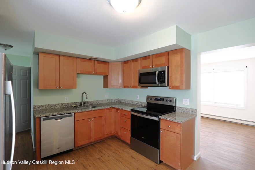 Spotless two-story, end unit apartment! The kitchen has stone counters, a range, a refrigerator, a microwave, and a dishwasher. The laundry room is located behind the kitchen, tenant can install their own units and there is also a new half bathroom. Second-floor bathroom has stone counters and updated fixtures. Large storage closet on the first floor under the stairs Front and back porch, back yard. Living room 11'3x14 Kitchen 11'3x12 Bed 1: 11'3x12'8 with three closets Bed 2: 10'6x11'3 Excellent credit, proof of income, and excellent rental history/references are required. Hudson River Views and a short walk to the Waterfront Park Tenant pays for Heat, Hot water & electricity (natural gas). Tenant pays for Heat, Hot water & electricity (natural gas).