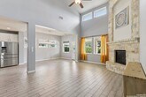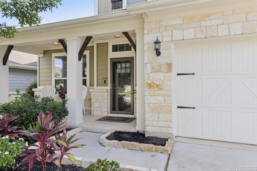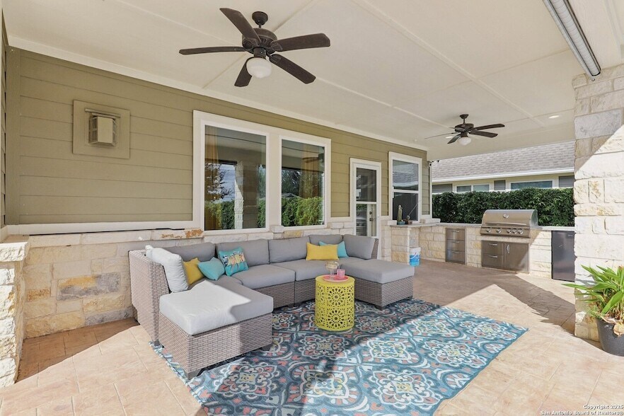 Step inside this beautiful home where soaring ceilings and a cozy stone fireplace welcome you in. The open-concept layout offers plenty of room to relax or entertain, with a spacious kitchen featuring granite countertops, stainless steel gas appliances, and a large island that flows seamlessly into the living area. Upstairs, you'll find three generously sized bedrooms and a versatile game room perfect for movie nights, a home office, or play space. The primary suite is conveniently located downstairs and includes a luxurious walk-in shower and oversized closet, creating a true retreat. Enjoy year-round outdoor living on the extended covered patio complete with a built-in grill and beverage fridge. The private backyard oasis features a sparkling in-ground pool with bubblers, lush landscaping, and sunshades for comfort and privacy. Residents can take advantage of community amenities including a resort-style pool, clubhouse, playground, park, sports courts, and scenic walking trails everything you need for an active lifestyle. Located near Randolph Air Force Base, local schools, and within walking distance of Founders Classical Academy, this home combines convenience, comfort, and a welcoming community atmosphere.