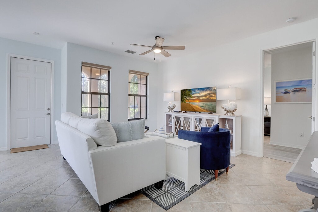 Welcome to this spacious seasonal rental townhome in the vibrant Paseo community of Fort Myers, Florida. With over 1,200 square feet of living space, this first-floor corner townhome is located in the southeast part of Paseo on Quad #5, offering its own pool separate from the main amenities center. The home features a screened front lanai, perfect for relaxing and socializing with neighbors and friends. Step inside to an open-concept floor plan with a dining room that seats four, offering views of the subtropical landscape. The kitchen boasts solid stone countertops, hardwood cabinets, and stainless steel appliances, with a counter that opens to the family room, complete with a sofa, accent chair, stools, and a large smart TV. The main bedroom includes a king-size bed, en suite bathroom, and ample storage, while the second bedroom features a queen bed and a large closet. A full-sized washer and dryer are conveniently located in the laundry room. Guests have access to four bikes, beach chairs, tennis and pickleball rackets, and beach umbrellas for outdoor enjoyment. Pets are not allowed in this property. Paseo's Village Center is the heart of the community, offering a range of social, recreational, and dining experiences. Enjoy coffee and tea in the mornings, ice cream treats, and a state-of-the-art theater for movie nights. Stay active in the fitness center or relax at the luxurious Spa & Salon. Dining options include the Pub, the Bistro, and poolside Tiki. Fort Myers International Airport is less than a 20-minute drive away, making travel convenient. This property is managed by a trusted partner with a 24/7 call center and professional cleaning services. A vehicle is recommended for getting around Fort Myers. Self check-in is available with codes provided after full payment and HOA approval. Quiet hours are from 22:00 to 8:00. Registration Number: Florida state permit number: #CND2103205 [SI]