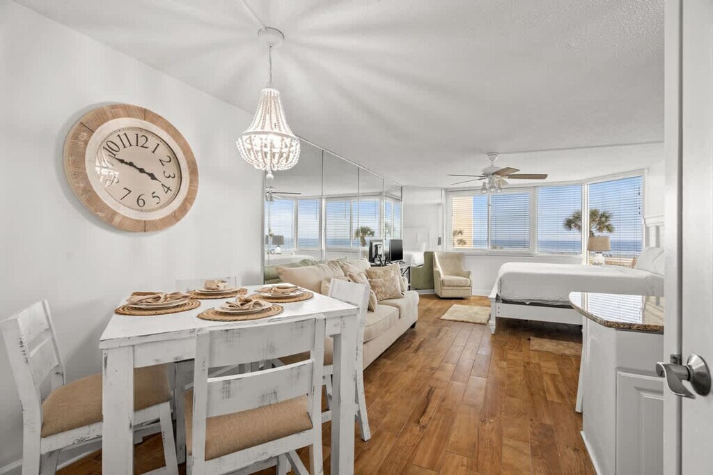 Feel at home in this gulf-front studio condo in Panama City Beach, offering soothing views of the Gulf of Mexico and the white sands below. Inside, prepare quick beach snacks or full-course dinners in the well-equipped kitchen, complete with a breakfast bar. Gather around the dining table with four seats or kick back in the warm and inviting living area. A shared pool and sun deck provide plenty of fun. Seasonal beach chair service is available. Upon arrival, all guests will have to register at the HOA office to receive their parking pass and wristbands. The cost is $30, and they accept cash only. This waterfront condo sits right on the white sandy beach, while St. Andrews State Park, where you'll find miles of scenic nature trails, picnic areas, and waterways, is a short distance away. The famous Pier Park is only 10 miles away and has shopping, attractions, and big-name restaurants such as Margaritaville. For additional attractions for all ages, WonderWorks and the Shipwreck Island Waterpark are only a few miles away. You can get hands-on experience with dolphins and other marine animals at Gulf World. Check-in is at 4 PM CT (5 PM Spring Break and Major Holidays). This property requires armbands to be worn at all times while on the property for safety. The unit accommodates up to 4 guests maximum (including children and infants of all ages) per PCB Ordinance 1632. Having more guests than the maximum of 4 allowed by law could result in a fine starting at $500 and ejection, with no money refunded. Quiet hours are observed between 11 PM and 7 AM. This is a non-smoking and non-pet-friendly unit. [SI]