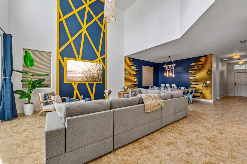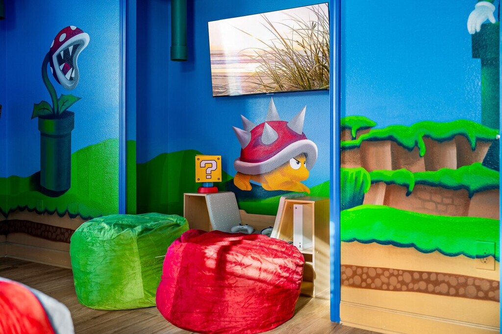 The advertised rate of $11,156/month is the lowest available price, based on a 1 month(s) stay with a move-in date of November 20, 2026. Rates vary depending on the duration of stay, season, and other parameters. For exact pricing and additional pricing components, please visit our website and enter your desired move-in and move-out dates. The rate is applicable when billed upfront; it can be higher if billed in multiple payments. Escape to an unforgettable Disney adventure in this home, just 9 miles from Walt Disney World! Perfect for Mario Bros, Moana and Princess Peach fans, feel at home in this 5-bedroom home that sleeps 15. This home features themed rooms, cozy bedding, a private heated pool with a safety net, and a free BBQ grill. Enjoy movie nights in the Mario Bros themed movie theater with a 4K projector and 5.1 Dolby surround sound. The fully equipped kitchen includes modern appliances, cookware, and a coffee bar with a Keurig, 12-cup drip, and French press. For your convenience, there are dual washers and dryers, central A/C and heating, and TVs in all adult bedrooms. Pool heat is available for $35 per day and dogs are welcome for an additional fee. Located 9 miles from Walt Disney World, 16 miles from Sea World, 19 miles from Universal, and 27 miles from Orlando International Airport, this home also provides free access to Paradise Palms Resort amenities, including a zero-entry resort-style pool and water slide, kids’ splash pad and playground, spa, grotto spa and poolside bar, fitness center and sports courts, clubhouse movie theater and arcade, and an onsite restaurant, coffee shop and gift shop. Walmart is just 3 miles away for any essentials. Parties are strictly prohibited, and a $1,500 penalty fee will be charged for any violations or reported parties. No tampering with smoke detectors is allowed, and there is a $1,000 fine for doing so. Lost keys have a $500 replacement fee. Includes a dedicated work desk and fast Wi-Fi with indoor and poolside coverage. Guests are responsible for refilling the BBQ propane tank during their stay. Up to 2 dogs are welcome (within the insurance policy's accepted breeds) for a $150 pet fee. Please keep your pets leashed outside, never leave them unattended unless crated, and clean up after them. [SI]