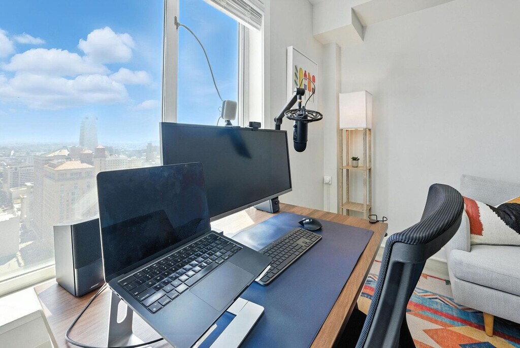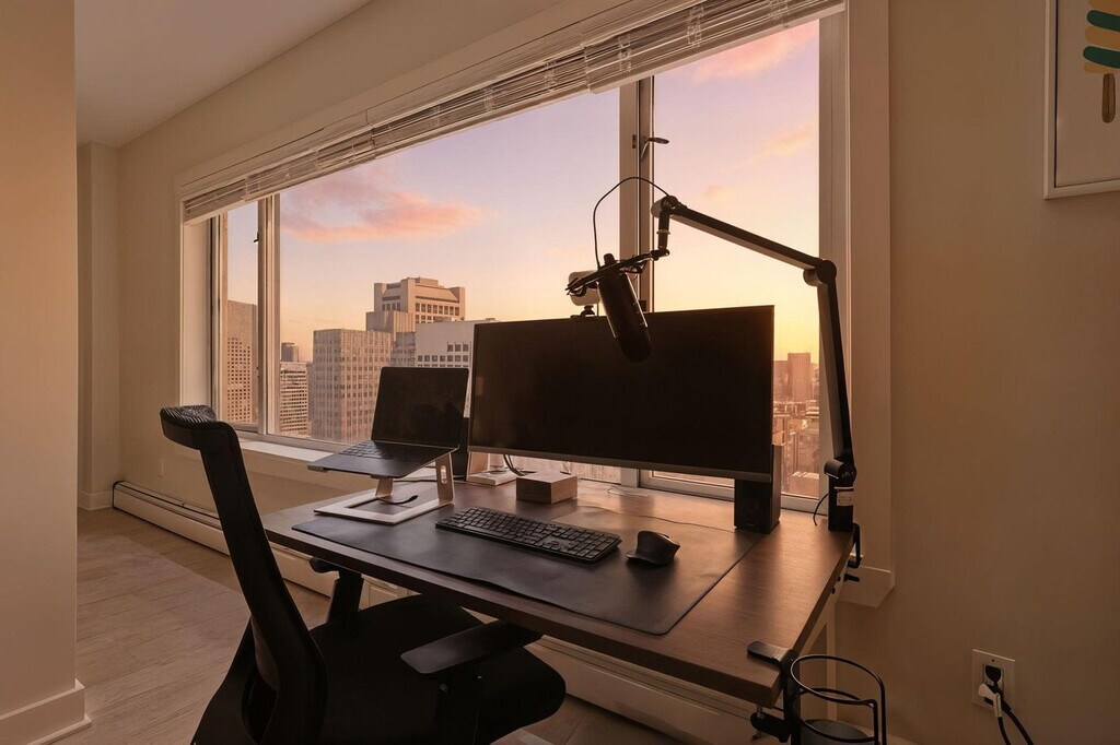 Enjoy upscale living with sweeping views in the historic San Francisco neighborhood of Nob Hill. This apartment at The Pinnacle offers open-plan, stylish interiors with a contemporary design, featuring hardwood flooring, stainless steel appliances, and plenty of closet space. Take in the breathtaking, panoramic views from the sunny rooftop lounge, get in a workout at the state-of-the-art fitness center, or unwind in the resident lounge using the high-speed Wi-Fi. This fully furnished studio apartment is custom tailored for the remote worker looking for a comfortable and inspiring environment in which to be productive. Along with stunning views of the city and surrounding hills, the unit includes a fully equipped kitchen, full bathroom, queen-size mattress, walk-in closet, smart TV, and all utilities. Paid parking is available upon request based on availability and EV vehicle rental and charging are available. Internet speeds are not guaranteed and may fluctuate based on your computer model and the router location. A laptop computer is not included in the home office set-up. This unit does not have air conditioning and can reach high temperatures on a sunny day, but standing fans are provided in the unit. Includes private high-speed internet, standing desk (Uplift), ergonomic work chair (Uplift), 34-inch ultra-wide monitor (Samsung), microphone (Blue Yeti), webcam (Logitech), computer speakers (Bose), LED streaming light, green screen, keyboard (Logitech), mouse (Logitech), laptop stand, and TOTU 16-in-1 Triple Display USB-C 3.1 Docking Station.