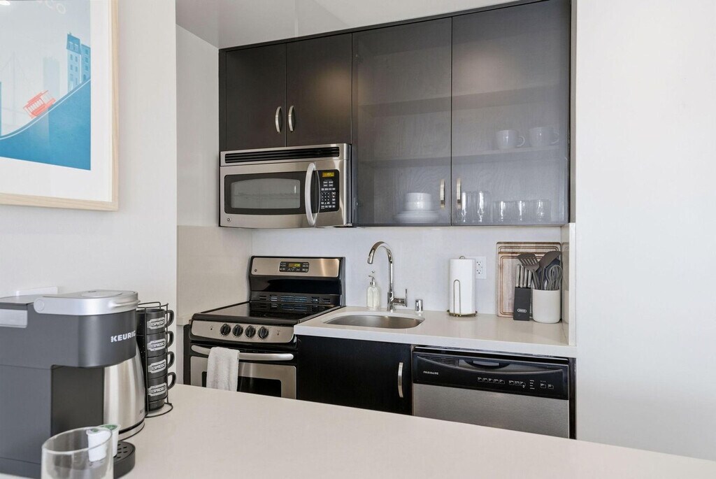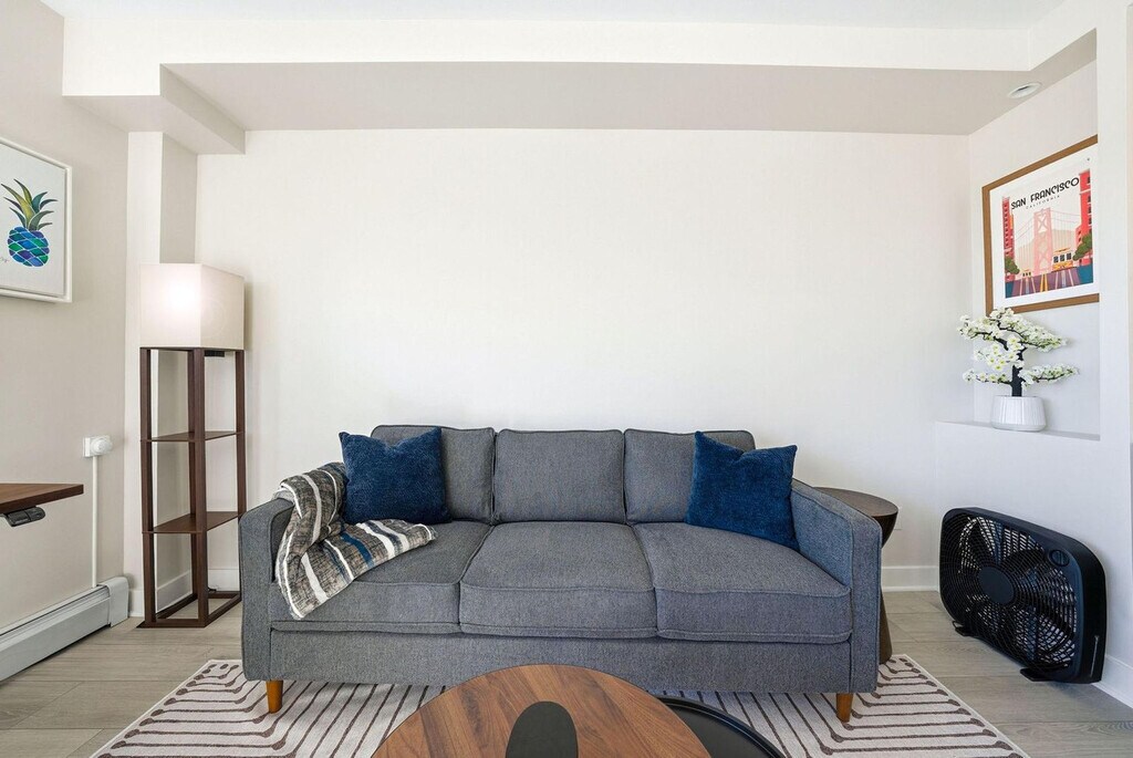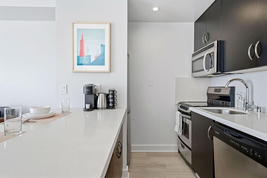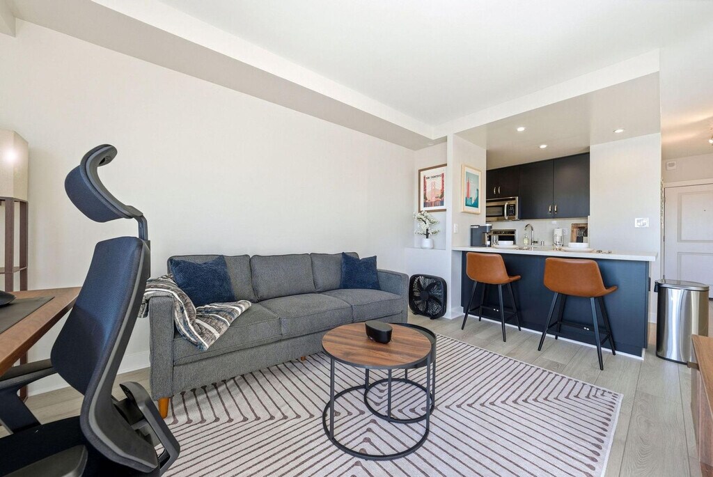 Enjoy upscale living with sweeping views in the historic San Francisco neighborhood of Nob Hill. Feel at home in this fully furnished studio apartment at The Pinnacle, offering open-plan, stylish interiors with a contemporary design. This apartment features hardwood flooring, stainless steel appliances, plenty of closet space, a fully equipped kitchen with a breakfast bar, in-unit laundry, a dishwasher, a smart TV, and all utilities. Amenities include a resident lounge, fitness center, sauna, and a rooftop lounge with outdoor seating. Paid parking is available upon request, based on availability, and EV vehicle rental and charging are also available. Take in the breathtaking, panoramic views from the sunny rooftop lounge, get in a workout at the state-of-the-art fitness center, or unwind in the resident lounge using the high-speed Wi-Fi. This unit does not have air conditioning and can reach high temperatures on a sunny day; standing fans are provided in the unit. Internet speeds are not guaranteed and may fluctuate based on your computer model and the router location. This apartment is custom tailored for the remote worker looking for a comfortable and inspiring environment in which to be productive. Along with stunning views of the city and surrounding hills, the unit includes a full home office set-up with private high-speed internet. Includes a standing desk (Uplift), an ergonomic work chair (Uplift), a 34-inch ultra-wide monitor (Samsung), a microphone (Blue Yeti), a webcam (Logitech), computer speakers (Bose), an LED streaming light, a green screen, a keyboard (Logitech), a mouse (Logitech), a laptop stand and a TOTU 16-in-1 Triple Display USB-C 3.1 Docking Station. A laptop computer is not included. Partners reserve the right to conduct secure ID verification, background checks and request Proof of Income. Guests will have 24 hours to complete these steps. Booking confirmation is contingent upon the successful completion of these checks, as well as meeting the minimum eligibility requirements. [SI]