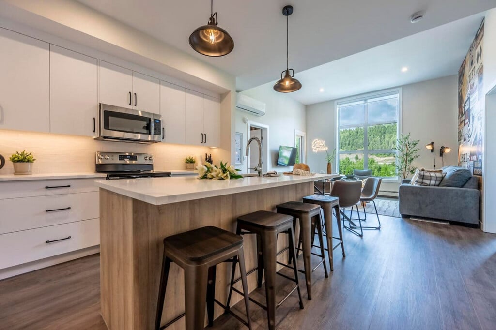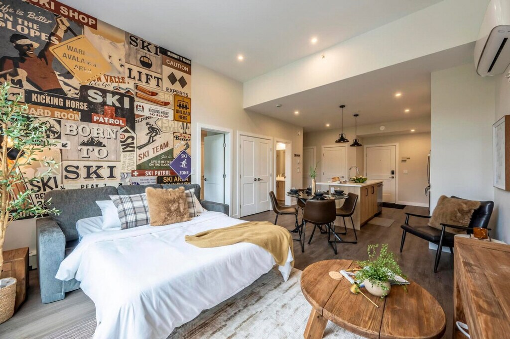 Welcome to Après Ski Golden, your upscale, cozy, and stylish mountain retreat. This 2-bedroom, 2-bathroom suite is located on the top floor, offering stunning mountain views and a warm design that invites relaxation after a day of adventure. Whether you're hitting the slopes or planning your next escapade, this alpine escape blends cozy charm with elevated comfort. Enjoy the fresh mountain air on the top floor balcony with no one above you, or plan your next adventure in the secret planning room. The suite comfortably sleeps six and includes air conditioning, a full kitchen, in-suite laundry, fast Wi-Fi, and self check-in for your convenience. Inside, relax with modern decor, watch cable TV, or stream your favorite shows on your streaming apps. The fully stocked kitchen is equipped with stainless steel appliances, including a microwave, fridge, and electric stove, along with glasses, mugs, dishes, and cutlery. The suite also features a laundry room with a washer and dryer, complete with complimentary supplies such as detergent, iron, and ironing board, ensuring a hassle-free laundry experience. Parking is free and first come, first served, with plenty of options including on-site outdoor stalls, nearby street parking, and underground heated stalls. The property also provides a dedicated on-site ski and bike storage locker, keeping your equipment organized and ready for your next mountain outing. Nestled in the heart of Golden, you're just minutes from Kicking Horse Mountain Resort, the Golden Skybridge Adventure Park, local restaurants, and endless outdoor adventure. Whether you're here to ski, hike, bike, or simply recharge, this is your ideal base for alpine living. Located within walking distance from downtown Golden, this property puts you close to the Columbia River and the charming local shops, cafes, and restaurants that give the town its unique character. With easy access to Trans-Canada Highway 1, Golden is a perfect base for exploring Banff, Yoho, and Glacier National Parks—all just a scenic drive away. Quiet hours are from 10 PM to 8 AM. A $500 fee will be charged if there is evidence of any parties, loud disturbances, or unauthorized events. Smoking and illegal drug use are strictly prohibited inside the property, with a $250 fee charged if evidence is found. The maximum number of guests is six, and all guests must be listed on the reservation. Unauthorized guests will incur a $40 fee per person per night. A $250 fee will apply for lost, damaged, or missing keys, key fobs, or access devices. Do not tamper with smoke detectors, fire alarms, or security cameras, as a minimum $100 call-out fee will be charged to inspect and reset the system. Late check-out fee of $50 will be applied if you have not vacated the property 30 minutes after check-out time unless prior permission is granted. If check out is more than two hours late, you will be charged for an additional day at the base nightly rate, but this does not award you to stay for the additional day as this could impact other reservations. Registration Number: H079477895 [SI]