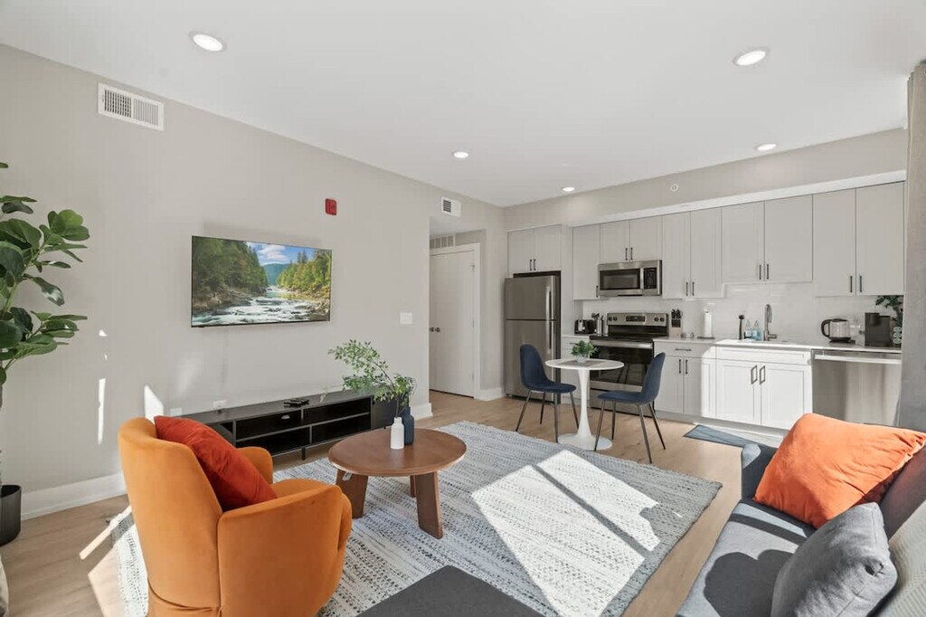 Experience refined comfort in this stylish 1-bedroom, 1-bathroom apartment in the heart of Philadelphia. Just steps from iconic landmarks like the Liberty Bell, Independence Hall, and Reading Terminal Market, this modern retreat blends upscale design with thoughtful touches. Enjoy a fully equipped kitchen, plush queen bed, high-speed Wi-Fi, and elegant living space, perfect for business or leisure travelers seeking sophistication, convenience, and an unforgettable stay. Welcome to your stylish Philadelphia retreat! This modern 1-bedroom, 1.5-bathroom apartment comfortably sleeps four, featuring a queen bed in the bedroom and a twin pull-out sofa in the living room. Perfect for families, friends, or business travelers, it combines comfort, convenience, and thoughtful design. Relax in the bright living area and enjoy your favorite shows on the 55” flat-screen TV, or cozy up with a book after exploring the city. The fully equipped kitchen includes a coffee maker, toaster, and all necessary utensils, so you can enjoy homemade meals or morning coffee at your leisure. For those who need to stay productive, a dedicated workspace with a desk and chair provides the perfect spot to work remotely or plan your Philly adventures. The apartment also features a washer and dryer, making it convenient for short getaways or longer stays. Pets are welcome with prior approval based on size and type. A cleaning fee per pet applies as follows: $25 per night for 1–4 nights, $200 for 5–29 nights, and $300 for 30+ nights. Located near iconic Philadelphia attractions such as the Liberty Bell, Independence Hall, Reading Terminal Market, and vibrant Old City restaurants, this apartment offers the ideal balance of urban convenience and homey comfort. Whether you’re visiting for business, sightseeing, or a relaxing getaway, this modern retreat ensures a memorable stay with everything you need at your fingertips. Enjoy a private stay while knowing help is just a message away. We’re happy to assist with any questions or needs during your visit. Treat the space with care and respect. Check-in instructions may be shared only after successful verification. A laptop computer is not included. [SI]