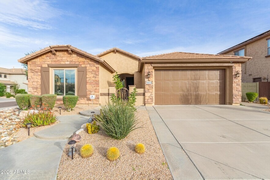 NOW available for lease, this well-maintained single-story Pulte Hummingbird model in West Wing offers desirable north-south exposure & a professionally painted interior & exterior (2025). Open floor plan with clear sightlines from entry through the spacious great room to the backyard. Oversized kitchen features maple cabinetry, GE Caf appliances, granite counters, double ovens, pull-out drawers & excellent storage. Primary suite includes backyard access & a large walk-in closet. Low-maintenance backyard with custom saltwater pool featuring Baja shelf, 6-ft lap section, in-ground cleaning system & water feature. Weekly pool service & monthly landscape maintenance included. Community amenities include walking paths, playground, tennis courts & clubhouse/rec room. Bedrooms 2 & 3 are generously sized, each with walk-in closets & a shared Jack & Jill bathroom. Large laundry room with granite counters & ample storage. Backyard also includes pavers & a landscaped cactus garden. Additional features include multi-speed Trane HVAC with 4-zone climate control, window tinting on all windows (blocks 99% UV rays), whole-house air purification, & EcoWater whole-house water treatment system with separate R/O. High-quality lease opportunity in a desirable West Wing community.