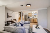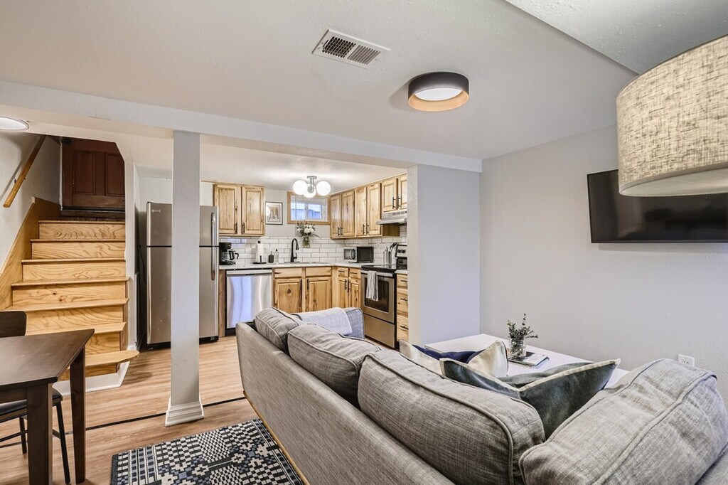 This spacious 735 sqft basement 1-bedroom apartment at 540 E 1st Ave offers a private entry from the side of the house. With a large kitchen and den featuring a work-from-home set-up, the apartment is bathed in natural light from east-facing windows, creating a welcoming atmosphere where you can truly feel at home. Newly renovated and furnished in March 2023, this apartment boasts a comfy queen bed with linens and a fully stocked kitchen. Enjoy the communal backyard with a grill and outdoor dining table, perfect for relaxing or entertaining. All utilities, parking, and internet are included, offering a $150+/month value. Enjoy fast internet with 300mbps download and 10mbps upload speeds. The apartment features a smart TV for streaming your favorite services, and free communal laundry is available in the basement. Pet rent is $90 per dog per month, with a strict no cats policy. Located just 2 blocks from Cherry Creek Trail, this apartment offers easy access to Downtown and the Cherry Creek Shopping District. Walk to nearby restaurant areas, Wash Park, and the neighborhood coffee shop, Rosebud Cafe. Trader Joe's is a short drive away, and you're only 10 minutes from downtown Denver, RiNo, and LoHi. Red Rocks and ski resorts are also within reach, making this a prime location for exploring the city and beyond. This is a long-term furnished rental, not a 24/7 bed and breakfast or full-service hotel. Our team is available during business hours and after hours for emergencies. A lease agreement is required upon booking. Noise disturbances may result in eviction without refund. All properties are non-smoking and non-vaping, with violation resulting in damage fees. Check-out time is 10 AM, with a $50 fee for every additional 30 minutes past check-out time. Pets are not allowed on furniture, and excessive cleaning charges due to pets will be applied. Personal property left behind will incur a minimum $50 returned item fee. The apartment includes a work-from-home set-up in the den, providing a comfortable space for remote work. [SI]