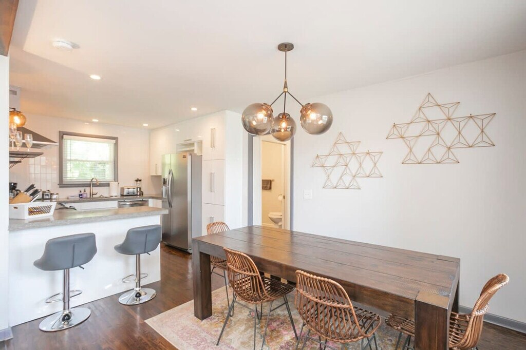 Feel at home in this spacious ranch-style home located in a peaceful, family-friendly neighborhood in East Nashville. This 3-bedroom, 2-bathroom house offers a bar/lounge area, a fenced yard, and excellent parking. Situated near Shelby Park, it's just an 8-minute drive from Five Points and 4.5 miles from Broadway, making it perfect for families and music lovers alike. This well-kept 1970s ranch-style house is located 10.8 miles from Nashville International Airport, about a 20-minute drive. The living room features a smart TV and high-speed internet. Each of the three spacious bedrooms comes with its own comfortable bed and closet, with two bedrooms also equipped with smart TVs. The sleeping arrangements include a king bed with a TV in Bedroom 1, a queen bed with a TV in Bedroom 2, a full bed in Bedroom 3, and a sleeper sofa with a TV in the living room. There is an additional $300 fee for guests wanting to book the property for filming and photography, with a location agreement required prior to the shoot date. Set in East Nashville, the house is a short drive away from popular restaurants, supermarkets, and charming cafes. Enjoy a stroll through the nearby Shelby Bottoms Nature Center and Greenway, or drive 15 minutes to explore Downtown's iconic nightlife. The property is conveniently located within driving distance to convenience stores, gas stations, and some restaurants. It's only an 8-minute drive from Five Points and less than 20 minutes from Broadway, with Uber and Lyft services available for around $5 to $10. The house is 10.8 miles from Nashville International Airport, about a 20-minute drive. Additional guests outside of your confirmed guest count are not allowed unless pre-approved prior to your stay. The property has a zero-tolerance policy for being used as a base for parties or visitors to come and go. Exterior cameras are in place to verify who is entering the home. Exceeding the confirmed guest count will result in immediate eviction and a $500 fine. A $50 fee applies for any glitter or leftover decorations. The primary guest must be 21 years or older, and photo ID information must match the credit card details. Ensure all doors are shut and locked when not in use, and do not leave valuables in your vehicle if parked on the street. Registration Number: [SI]