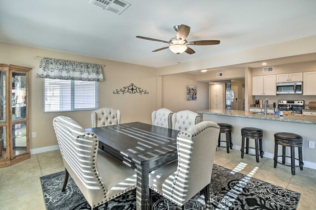Escape to the Copper State and feel at home in this 2-bedroom, 2-bathroom Sun City vacation rental. This home is perfect for your next getaway and offers step-free access. This newly renovated home features a fire pit table, Smart TVs, a dining table, a breakfast bar, a walk-in shower, a shower/tub combo, and ceiling fans. The kitchen is equipped with stainless steel appliances including a dishwasher, cooking basics, dishware and flatware, a coffee maker, a blender, a Crockpot, an ice maker, a microwave, a toaster, a toaster oven, and spices. You'll also find complimentary toiletries, a hair dryer, a washer/dryer, hangers, an iron and board, linens and towels, and starter trash bags and paper towels. Community amenities including a pool, hot tub, and recreation center are available for an additional fee paid upon arrival. Parking is available in the garage for one vehicle and in the driveway for two vehicles. Spend your days grilling out and relaxing on the porch or patio, or taking a dip in the community pool. Head out for a stroll through Butterfly Wonderland or the Glendale Xeriscape Garden. The home also includes 2 bicycles with helmets, outdoor seating and dining, string lights, and a fenced-in yard. Smoking, pets, events, parties, and large gatherings are not allowed. Guests must be at least 55 years old to book. Additional fees and taxes may apply, and a photo ID may be required upon check-in. [SI]