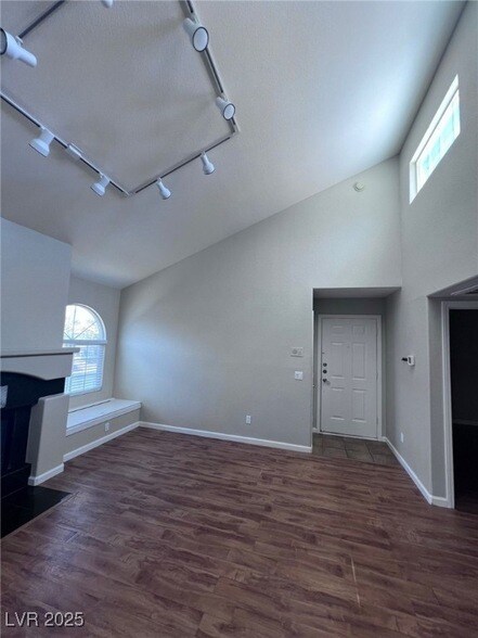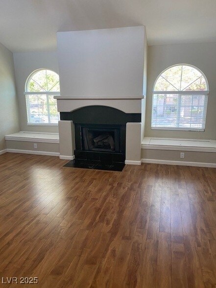 Open floor plan with vaulted ceilings, fireplace in the living area, and large windows providing plenty of natural light. No carpet wood-look flooring throughout with tile in kitchen and baths. Kitchen features granite counters, breakfast bar, and ample cabinet space. Split bedroom layout for added privacy. Spacious bathrooms with tile flooring. Custom paint colors, private balcony, and located in a beautifully landscaped community.