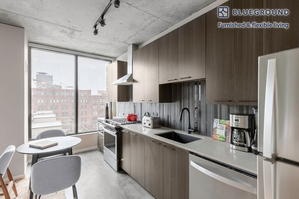 Feel at home wherever you choose to live with Blueground. You’ll love this roomy West Loop furnished studio apartment with its modern decor, fully equipped kitchen, and cheery living room with great views. Ideally located, you’re close to all the best that Chicago has to offer! (ID #CHI205) The advertised rate of $2,370/month is the lowest available price, based on a 1 month(s) and 29 day(s) stay with a move-in date of February 16, 2026. If you’re looking for a 1-year stay, the rate is $2,730/month. Rates vary depending on the duration of stay, season, and other parameters. For exact pricing and additional pricing components, please visit our website and enter your desired move-in and move-out dates. The rate is applicable when billed upfront; it can be higher if billed in multiple payments. Brokers are welcome to reach out. Were you looking for an unfurnished lease? Try Blueground instead and upgrade from unfurnished to furnished living: - Furnished at rates comparable to unfurnished - No setup or furniture costs - save thousands - Move-in ready - save time, just bring your suitcase Designed with you in mind As with any Blueground apartment, you’ll find a thoughtfully designed space complete with beautiful furniture and a fully equipped kitchen in this studio property. And, thanks to our superior quality mattresses, luxury linens, and towels, you can relax knowing you’ll always feel comfortably at home. When you’re ready for some fun, you can take in the Chicago vibes or bring the entertainment to you with the premium wireless speaker or smart TV. This apartment also offers in-apartment laundry. Sleeping arrangements Queen Bed, 63in/160cm Amenities Building amenities unique to this studio apartment include an on-site: - BBQ Area - Doorman - Dryer - Elevator - Swimming pool - Washing machine - Lounge - Parking - Pets allowed - Rooftop BBQ Arrival and ongoing support The entire apartment is yours to enjoy! Throughout your stay, you’ll have access to our Client Experience team through the Blueground App. You can schedule additional cleanings, submit maintenance requests, and view our neighborhood recommendations with just a few taps. We’ll share all details upon confirmation of your stay. Ideally Located Located in West Loop, this furnished rental invites you to explore the edges of downtown Chicago. From endless dining and bar options to art galleries and stylish shops, West Loop has emerged with so much to offer daily. During weekends, residents savor trips to the Chicago French Market and the vibrant strip of Randolph Street. The latter is known as “Restaurant Row” and is lined with some of the city’s best eateries. Fulton Market, one of the hippest and fastest-growing neighborhoods, is ideal for dinner and drinks. Union Station is only a 5 to 10 minute walk away. Other things to note Building amenities may have an extra cost. This Blueground apartment has flexible lease options, allowing you to book it for one month, a year, or more. Pets are welcome, though weight limits and breed restrictions apply and may incur fees. Parking is offered based on availability and is subject to a fee. We take great pride in ensuring every photo displayed is shot in our own units with our actual furnishings. That said, we regularly refresh our decor and furniture arrangement, which may differ from what’s pictured. Also note - This apartment is located in an industrial zone, so it can be noisy inside from time to time - This apartment's central location means it can be noisy at times - This is a guarded building equipped with a doorman/concierge at all times [SI]