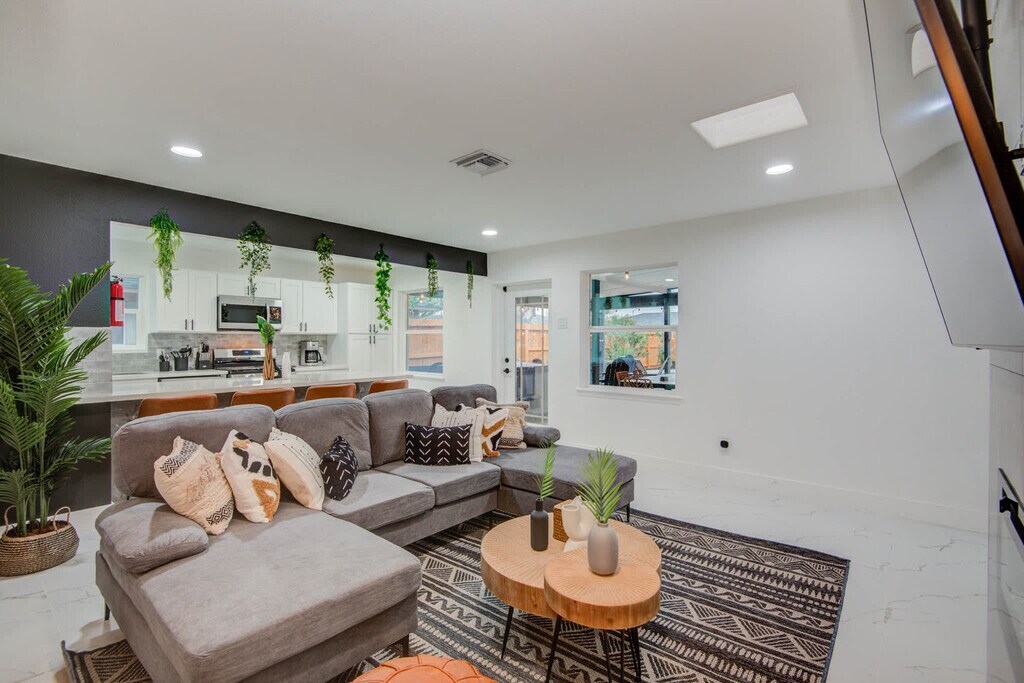 Welcome to your home away from home in the much-desired centrally located community of Spring Branch. This vacation home offers a modern comfort with a beautiful open-concept layout, a fully equipped dream kitchen, and five bedrooms, providing plenty of sleeping space. Conveniently located, you're only minutes away from some of Houston's prime attractions. Our home caters to both short-term and medium-term stays, making it an excellent choice for corporate housing needs. Featuring a bold contrasting center kitchen island, the fully equipped kitchen includes stainless steel appliances such as a fridge, freezer, stove, oven, dishwasher, and microwave. The dining room, with its bold geometric accent wall, offers a dinner table with seating for six or more, and a breakfast bar at the kitchen island. The living room, furnished for comfort, invites you to relax with its open-concept layout, high-speed Wi-Fi, and cozy seating. Free parking is available in the garage and on the driveway, with additional street parking if needed. We welcome house-trained pets with a non-refundable pet fee of $150 per pet, with a maximum of two pets per stay. An additional nightly rate applies for more than six guests, with a $29/night fee for each extra guest. Nestled conveniently between the 610 Loop and Beltway 8, this prime vacation home offers an urban-suburban feel. Located only minutes from downtown and the Energy Corridor, you'll find an abundance of family-friendly activities and community appreciation here. Houston is known for its tasty Tex-Mex and contributions to space and science, offering plenty of southern charm. Nearby attractions include the Houston Museum of Natural Science and Minute Maid Park, both within a 21-minute drive. Smoking of any type is not allowed, with violations subject to a $450 fine plus the cost to clean, deodorize, and repair damages. Check-in is at 4pm and checkout is at 10am. No parties or large gatherings are allowed, and only registered guests are permitted. A noise alert device is installed to monitor decibel levels, ensuring compliance with local noise ordinances. The fireplace is electrically operated and should not be left unattended. We offer plenty of body towels, but guests are encouraged to bring their own pool towels. Smart TVs are equipped with streaming apps, and guests can log in with personal accounts. The living room is equipped with high-speed Wi-Fi, making it suitable for remote work-friendly stays. [SI]
