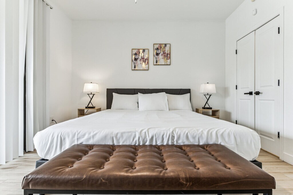 Feel at home in this newly built condo in Glendale, steps away from the stadium and some of the best shopping, dining, and golf courses in greater Phoenix. This condo is perfect for football, leisure, snowbirds, spring training, and business travelers. This condo is suitable for a family, group of friends, or business travelers and has all of the amenities necessary to enjoy your stay. Great amenities await you, including quartz countertops, stainless steel appliances, a fully equipped kitchen, 100mbps+ internet, modern decor, and a Smart-TV with streaming apps installed. Complimentary coffee and a patio are also included. Enjoy the resort-style heated pool, a jacuzzi hot tub, a fitness center, a large outdoor fireplace, a BBQ area, and an arcade. Pool access is allowed by season and weather. A pet fee between $100-$300 will be collected separately, based on stay length, for a maximum of 2 pets (40lbs combined), excluding Pit Bulls and Bull Mastiffs or similar breeds. All pets must be on a leash when outside on the property. Located in Glendale, right in the Westgate entertainment area, you can enjoy live music, movies, football, and dining all in one place, just across the street from the building. Ideally located close to different attractions, you are just a quick drive or Uber/Lyft ride away from anywhere. Smoking of any kind is not permitted within or outside of our suites, including balconies, patios, or common and/or parking areas. Any sign of smoking is a violation of our stay agreement, which may result in immediate termination and recovery fees beginning at $500. There is a $500 penalty for removing smoke detectors and a $200 penalty for lost key fobs. No outside guests are allowed without permission, and only one towel per guest per stay is provided. Guests must agree to not disturb neighbors at all times during the stay and observe quiet hours from 9pm-8am each day. Check-in is at 4 PM, and check-out is at 11 AM, with a $75/hr late fee. No weapons or drugs are allowed; police will be called for violating this rule. A valid photo ID is required to complete the booking. To abide by all legal requirements and HOA rules, you will be asked to provide a copy of your official government-issued photo ID, confirm your contact information, and pass through our verification portal. In some instances, you may need to complete a criminal background check. Minimum age requirement of primary person booking should be 22 years old for out of town guests and 25 years old for local guests. Includes [SI]