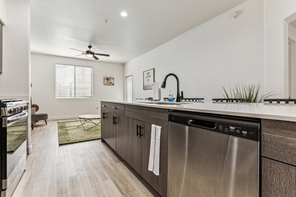 Feel at home in this newly built condo in Glendale, steps away from the stadium and some of the best shopping, dining, and golf courses in greater Phoenix. This condo is perfect for football, leisure, snowbirds, spring training, and business travelers. Stairs may be required, and the property is not wheelchair accessible. This condo is suitable for a family, group of friends, or business travelers and has all of the amenities necessary to enjoy your stay. Great amenities await you, including quartz countertops, stainless steel appliances, a fully equipped kitchen, 100mbps+ internet, modern decor, a Smart-TV with streaming apps installed, complimentary coffee, and a patio. Enjoy the resort-style heated pool, a jacuzzi hot tub, a fitness center, a large outdoor fireplace, a BBQ area, and an arcade. Pool access is allowed by season and weather. Max 2 pets (40lbs combined) are allowed with an additional pet fee of $100-300 based on stay length. Located in Glendale, right in the Westgate entertainment area, you can enjoy live music, movies, football, and dining all in one place, just across the street from the building. Ideally located close to different attractions, it is just a quick drive or Uber/Lyft ride anywhere. Smoking of any kind is not permitted within or outside of the condo, including balconies, patios, or common and/or parking areas. Any sign of smoking is a violation of the stay agreement, which may result in immediate termination and recovery fees beginning at $500. There is a $500 penalty for removing smoke detectors and a $200 penalty for lost key fobs. No outside guests are allowed without permission. One towel is provided per guest per stay. Guests must agree to not disturb neighbors at all times during the stay and observe quiet hours from 9pm-8am each day. The home is proactively monitored with decibel sensors for compliance with this noise policy. Check-in is at 4 PM, and check-out is at 11 AM, with a $75/hr late fee. To abide by all legal requirements and HOA rules, you will be asked to provide a copy of your official government-issued photo ID, confirm your contact information, and pass through our verification portal. In some instances, you may need to complete a criminal background check. No weapons or drugs are allowed; police will be called for violating this rule. [SI]