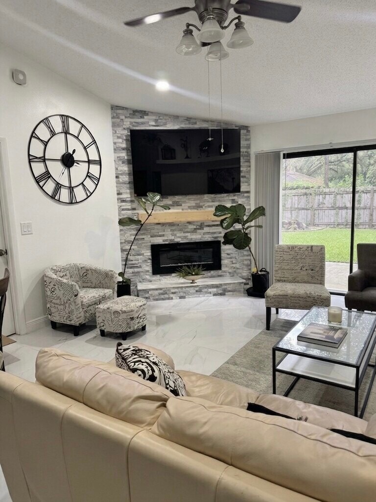 Property Id: 2447565 A private bedroom in a beautifully renovated 3-bedroom, 2-bathroom single-family home in Country Creek, one of Altamonte Springs' most distinctive residential communities. An unfurnished room in a well-maintained home with high-quality shared spaces and a quiet, respectful household. THE ROOM: Unfurnished private bedroom with marble-look porcelain tile flooring, a decorative upper display shelf, and a ceiling fan. Shares a renovated full bathroom with one other roommate, including updated fixtures and matte black hardware. The split floor plan provides natural separation from the master suite. THE HOME: Open-concept living and dining with vaulted ceilings, a stone fireplace, skylights, and a Smart TV. Renovated kitchen with stainless steel appliances and two full-size refrigerators. In-unit Samsung stacked washer and dryer, fenced backyard with fire pit, security cameras on the property for added safety, driveway parking, and street parking. Central AC. Strictly smoke-free. WHAT'S INCLUDED: WiFi, trash, recycling, professional lawn maintenance, and HOA fees. Water and electric are split equally among tenants (typically $80-120/person/month). Estimated all-in: roughly $930-970/month. Security deposit: $850. COUNTRY CREEK HOA: Semi-gated entry with covered bridge. 2 pools, tennis and pickleball courts, racquetball, basketball, walking and biking trails. LOCATION: 5 min to AdventHealth Altamonte Springs. I-4 and SR 434 access. Near Seminole State, Winter Park, and Downtown Orlando. Personal transportation required. HOUSEHOLD: One current tenant, a female working professional, who is easygoing and easy to live with. The home runs quietly and respectfully. Students welcome. OTHER THINGS TO NOTE: Single occupancy only. Minimum 3-month lease preferred. Security deposit: $850. Background check required. No pets. No smoking anywhere on the property. CONTACT: Text preferred for the fastest response.