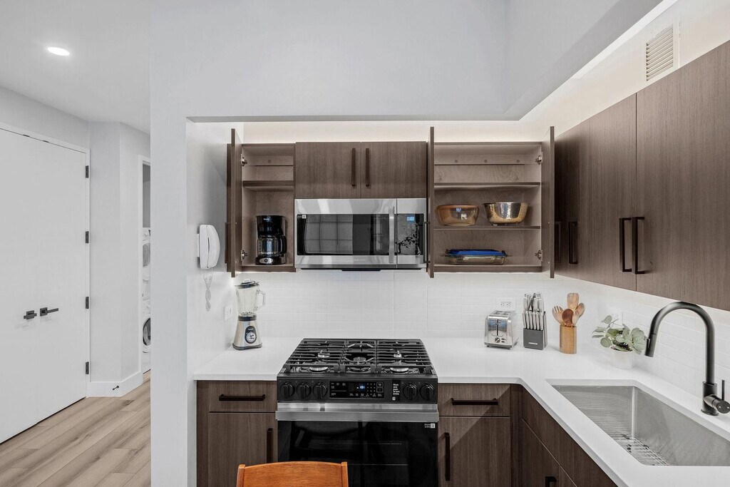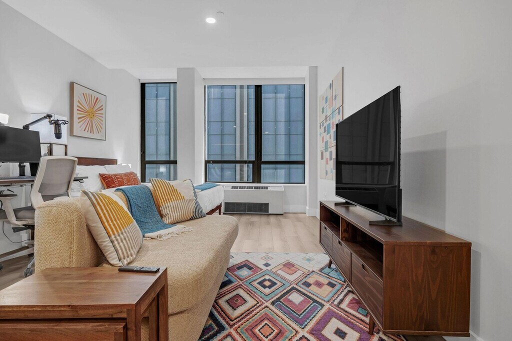 From the spectacular rooftop terrace views to the state-of-the-art fitness center, this apartment at 95 Wall is your home in the heart of the financial district, convenient to everything that matters. Stroll to work, jog to The Battery, or jump on the FDR, this is the luxurious and comfortable space you've been looking for. Custom designed for the remote worker looking for a comfortable and inspiring environment in which to be productive, this newly renovated unit includes a fully equipped kitchen, king-size mattress, full bathroom, smart TV, and all utilities. Parking is not provided, but may be available via the attached public indoor garage and guests must coordinate independently. Other garage parking is also available nearby. Located in the heart of the financial district, this apartment offers unparalleled convenience. With a Walgreens Pharmacy on the ground floor and Starbucks Coffee on the same block, daily essentials are just steps away. The apartment is one block from the ferry port, making commuting a breeze. The building is currently undergoing renovation and is expected to continue until Spring 2026. Internet speeds are not guaranteed and may fluctuate based on your computer model and the router location. Early check-in from 9am-3pm will incur a fee of $75 and before 9am will incur a fee of 1 full night's rent based on selected dates. Late check-in after 8pm will incur a fee of $50. Late check-out from 11am-3pm will incur a fee of $75 and after 3pm will incur a fee of 1 full night's rent based on selected dates. Includes private high-speed internet, a standing desk, work chair, 34-inch ultra-wide monitor, microphone, webcam, computer speakers, LED streaming light, green screen, keyboard, mouse, laptop stand, and a TOTU 16-in-1 Triple Display USB-C 3.1 Docking Station. A laptop computer is not included.
