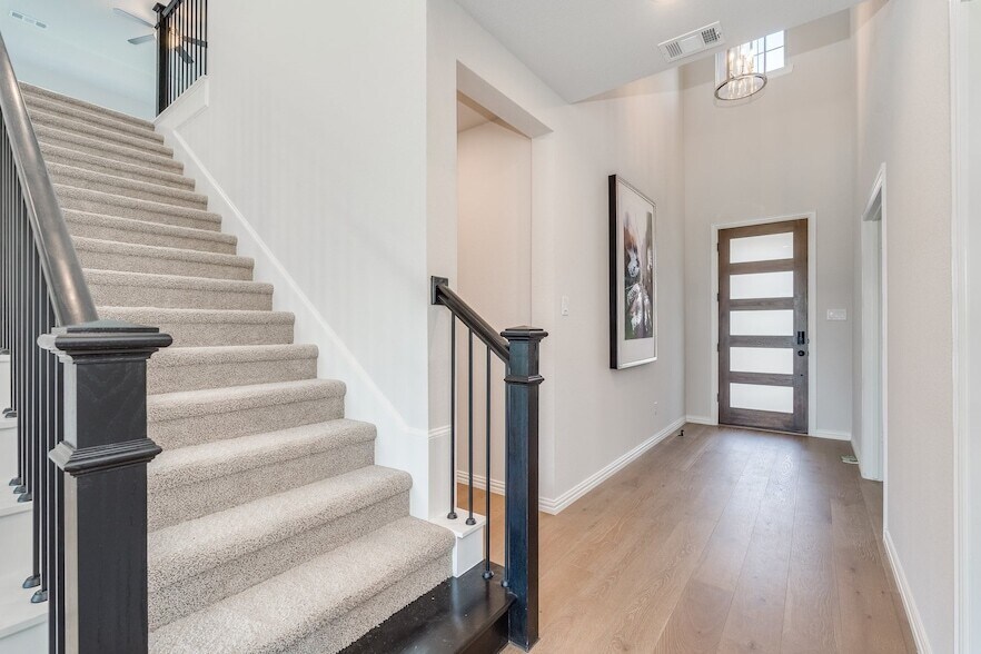 Immerse yourself in nature at Oak Point Park & Nature Preserve, a sprawling 800-acre greenspace featuring miles of trails, a lake for kayaking or paddleboarding, wildlife viewing, and the outdoor amphitheater for seasonal events.This spacious two-story residence features 4 bedrooms, 3.5 baths, and over 3,100 sq ft of elegant living space. The open concept layout includes a bright living room, stylish dining area, and a gourmet kitchen equipped with a gas cooktop, built-in oven, large island, and walk-in pantry. The primary suite is located on the main floor for added privacy, featuring a spa-like bath and generous walk-in closet. Upstairs offers three additional bedrooms, a game room, and a media room perfect for family fun or entertaining guests. With upscale finishes like wood-look tile, plush carpeting, and designer touches throughout, this home blends comfort and luxury effortlessly. Situated on an 8,500+ sq ft lot, the home includes a 2-car garage plus covered carport parking, and is part of Denton ISD, zoned to excellent schools. Enjoy community amenities, nearby Lake Lewisville, and convenient access to parks and shopping. This move-in-ready home combines modern design, space, and location.