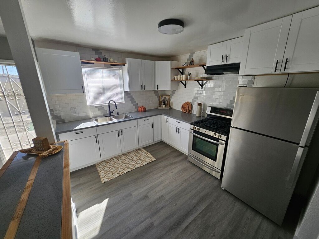 Elegantly remodeled three bedroom, two bath home. New kitchen, new baths, and new floors throughout. Walk-in closet, all-in-one washer/dryer included, spacious back yard, carport, and a beautiful low maintenance front yard.
