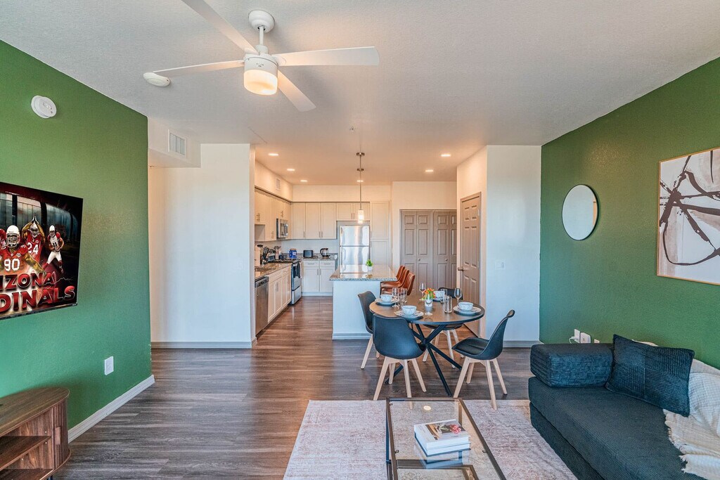 Feel at home in this modern and comfortable 2-bedroom apartment in the heart of Glendale, located on the 3rd floor of a walk-up building. You'll be close to great dining, shopping, and entertainment while relaxing in a thoughtfully designed space with cozy beds and a calm atmosphere. This spacious apartment features an open layout connecting the kitchen, dining, and living areas. The living room includes a sofa bed, a chair, a 4K 55" HDR smart TV, and a coffee table. The fully equipped kitchen features a microwave, stove, oven, refrigerator/freezer, dishwasher, coffee maker with coffee essentials, electric kettle, sink with hot and cold water, glasses, silverware, pots and pans, and a dining table with chairs. The bedroom includes a bed with pillows, linens, and sheets, an office desk and chair, and reading lamps. The full bathroom is stocked with essential toiletries, including towels, hand towels, and washcloths. Parking is available on the premises, and instructions will be given at check-in. Pets are allowed depending on size or if they are service animals with a fee of $20 per pet per night. There is a 2 pet maximum and only cats/dogs are allowed. The pet combined weight limit is up to 80 pounds. The following breeds (purebred and/or any mixed form) are currently restricted: Akita, American Bulldog, Chow Chow, Doberman, German Shepherd, Husky Breeds, Malamute, Pit Bull Breeds, Presa Canario, Rottweiler, Staffordshire Terrier, St. Bernard. This spot offers easy access to local attractions and a stylish, relaxing place to unwind. All guests must be 23 years old and above. If you are found to have brought pets without prior notification, there will be a $500 fee. There are noise monitors installed in the apartment that measure noise levels in decibels. If tampered with, there will be a fee. Security cameras are in the hallways for security. [SI]