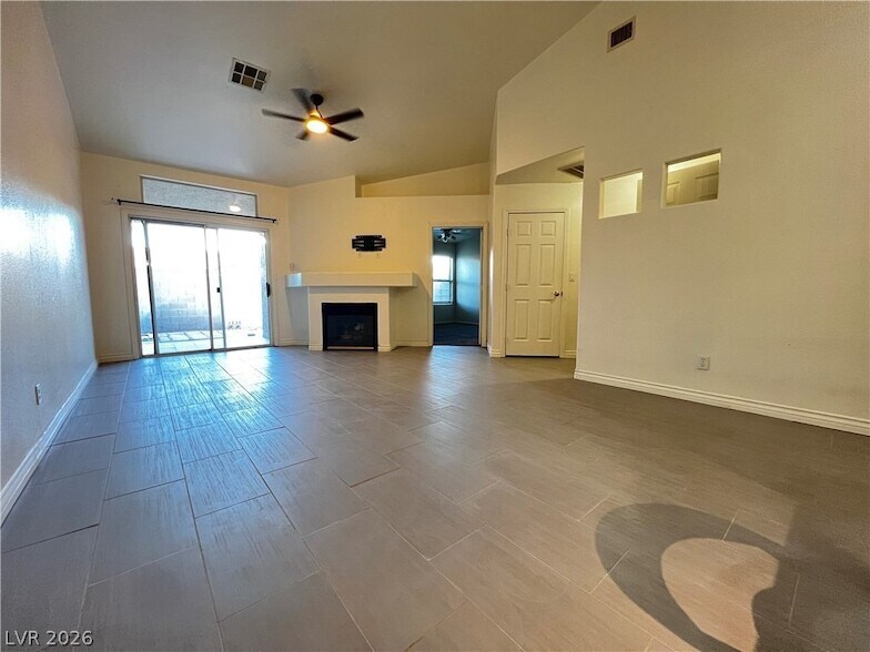 Beautiful single story townhome in gated community with pool. Upgraded kitchen and bathrooms. Tile flooring throughout living areas. Vaulted ceilings throughout. Kitchen with Stainless steel appliances, upgraded countertops, breakfast bar, and modern light fixtures. Great room with fireplace and ceiling fan. Primary bedroom with fan and walk in closet. Guest room with ceiling fan and mirrored closet doors. Covered patio area. This home is clean and ready for immediate move in.