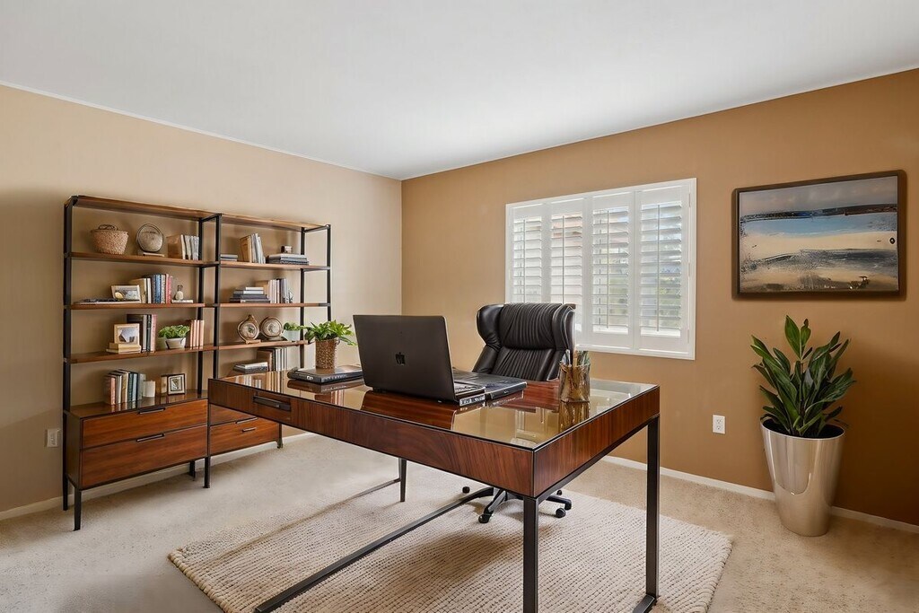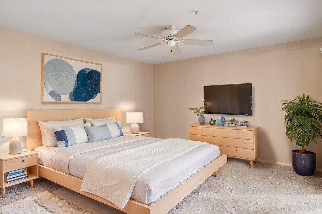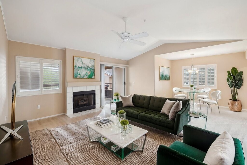 Discover your new home in the beautiful Villages Five Phase B community of Scottsdale, AZ. This charming 3-bedroom, 2-bathroom condominium spans 1,497 square feet and offers a perfect blend of comfort and style. The spacious living room features a cozy fireplace and a ceiling fan, seamlessly connecting to a bright dining area with large windows. The modern kitchen is equipped with stainless steel appliances and plenty of cabinetry. You'll also find a dedicated home office space and a generous master bedroom with a TV setup. Enjoy added convenience with an in-unit laundry area and a private balcony for outdoor relaxation. The well-maintained bathroom includes both a shower and bathtub, while ample closet space provides essential storage. The community pool area, surrounded by palm trees, adds a resort-style feel to your living experience. Your ideal home awaits! Schedule a tour today and see all this property has to offer.