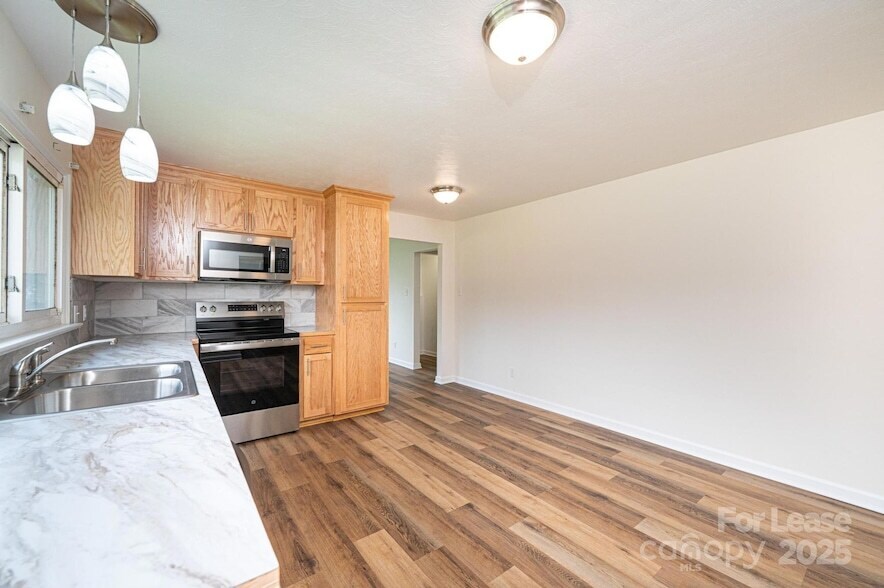 Welcome home to this beautiful updated house located in the Foothills of the NC mountains in Hickory!! This 3BR/2BA single level boasts an open floor plan. Most everything has been touched! From the refinshed hardwood floors to the new kitchen cabinets & appliances, you are going to love all the newness! The spacious living room features a fireplace with a beautiful stone surround & built-in cabinet with glass doors. The kitchen offers ample all new cabinetry, countertops, beautiful backsplash & lighting. The owner's suite features hardwood floors with an en-suite bathroom with a stylish vanity & a tiled shower. Laundry closet is designed for stackable washer/dryer on the main level. There are hookups in the basement as well. You will enjoy the covered side porch, not to mention, the basement! It offers extra space! Whether you need storage or a place to expand, it's clean and ready to fulfill your needs. Located a a corner lot! Convenient to shopping, restaurants and more!