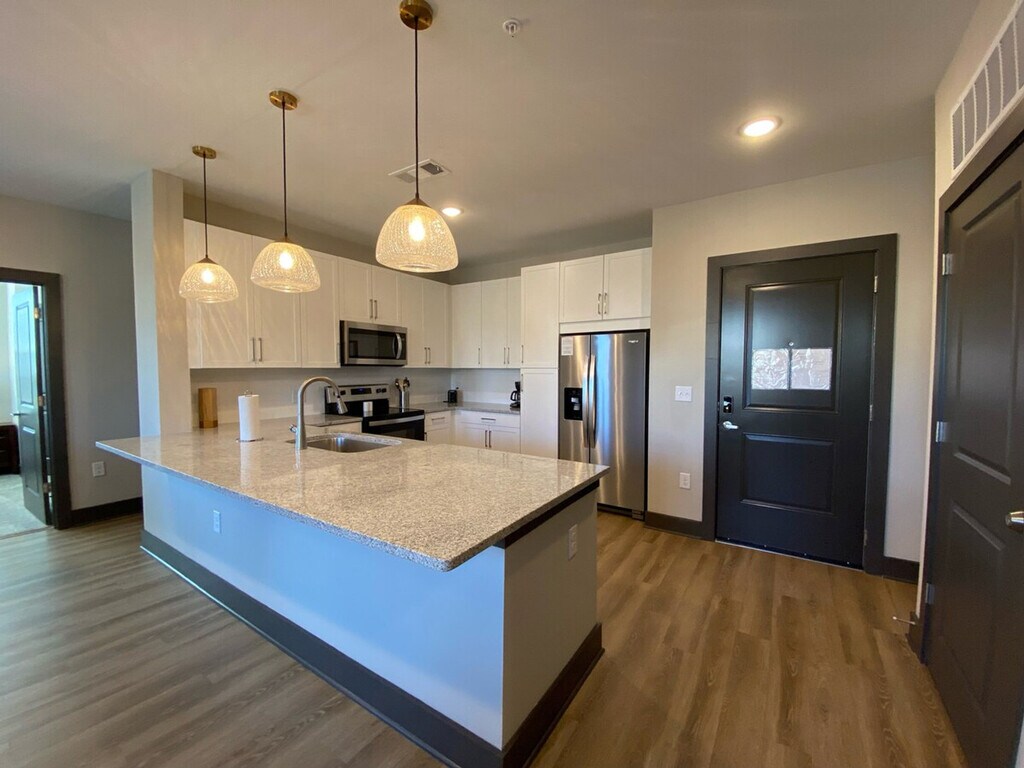 Feel at home in this bright and spacious open-concept apartment. This apartment features LED light fixtures, a gourmet kitchen with stainless appliances, pantries with ample storage, granite countertops and shaker-style cabinets, large islands, modern tile backsplash, plank hardwood flooring, high-efficiency washer and dryers, walk-in showers, and large terraces and balconies. Detached garages and electric car charging stations are available. Enjoy the business center with co-working space, game room with billiards, cyber café and coffee bar, 24-hour fitness center with yoga room, resort-style saltwater pool, outdoor terrace with patio seating, indoor bike storage, and package concierge, as well as the dog park. [SI]