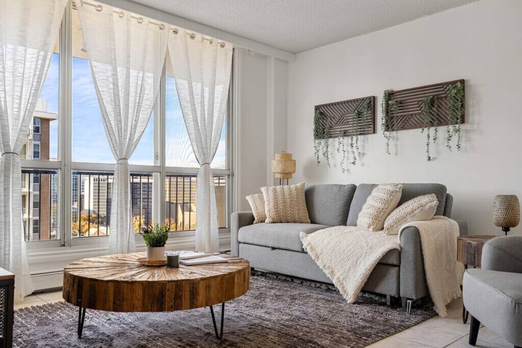 Feel at home in this cozy 2-bedroom suite located just minutes from the Ice District and Rogers Place. This apartment offers a comfortable stay with all the amenities you need, including a fully equipped kitchen, a living room with a 65-inch Smart TV, and a balcony with downtown views. Enjoy the convenience of free parking and easy access to major roads, making it simple to explore the city and beyond. This apartment is designed with your comfort in mind, featuring a fully equipped kitchen with modern appliances, a large dining table, and complimentary tea, water, and coffee. The living room invites relaxation with its large sofa bed, premium linens, and high-speed Wi-Fi. Enjoy access to the gym, sauna, and billiards room for added leisure. The apartment includes free covered parking, visitor parking, and paid city street parking. Additional supplies can be provided during your stay at an extra cost. Situated in a prime downtown location, you're just a short walk from Jasper Avenue's vibrant restaurants, cafes, and nightlife. The apartment is conveniently close to the Ice District, Rogers Place, Edmonton River Valley, and major educational institutions like MacEwan University and the University of Alberta. With quick access to Jasper Ave, 109 St, and Yellowhead Hwy, exploring Banff, Jasper, or the Rockies is a breeze. Check-in and check-out are fully self-service, with detailed instructions provided for a seamless experience. A $250 CAD fine will be charged for smoking violations, and quiet hours are from 10 pm to 7 am. Unauthorized late check-out will result in additional fees. Please remove outdoor shoes while in the home and be mindful of noise levels to avoid complaints. Stay connected with high-speed Wi-Fi, perfect for remote work or streaming your favorite shows. A laptop computer is not included. [SI]
