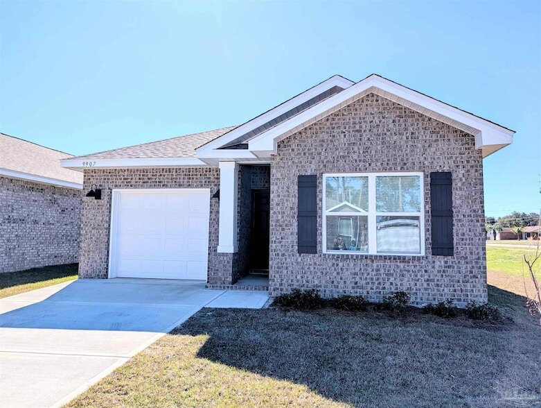 This beautiful single-story home featuring a split floor plan with 4 bedrooms, 2 bathrooms, and a 1-car garage with an open layout. Inside, you'll find easy access to the first three bedrooms and a guest bathroom, along with a spacious living area that combines the great room, kitchen, and dining space. The kitchen is a dream, equipped with an island, quartz countertops, and stainless-steel appliances. Spacious back yard and patio. The Master bedroom includes an attached bathroom with a vanity, walk-in shower, and large closet. Conveniently located near Blue Angel Parkway and Highway 98, you're just a short drive from the Pensacola Naval Air Station, shopping, dining, schools, and beautiful beaches. This home will include back yard with a 6 ft privacy fence.