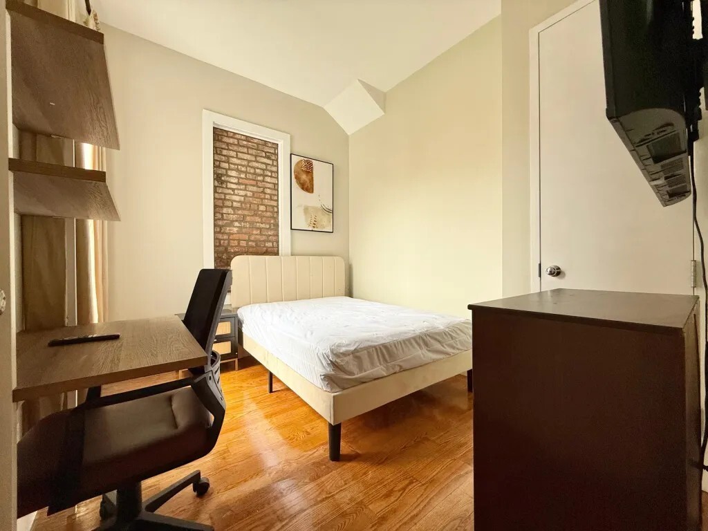 Room for rent: This private Queen room in a 4 bedroom / 2 bathroom apartment, located in Bedstuy City is available on a flexible 1-18 month leas. - Furnished 90 sq ft room, tons of natural light, hardwood floor, in a 4 bedroom, 2 bathroom, recently gut renovated apartment, Laundry and bike storage in building - Trains: 12 min to J train, 15 min to A train. Gates Ave station or Utica Ave station, 27 minutes to Manhattan. - Furniture: bed, mattress, wardrobe/closet, dresser, TV, curtains, desk, chair, sofa, kitchen table. - cafe's, restaurants, gym, bars all with-in a few min walk. - Location: corner of Jefferson Ave and Patchen Ave.