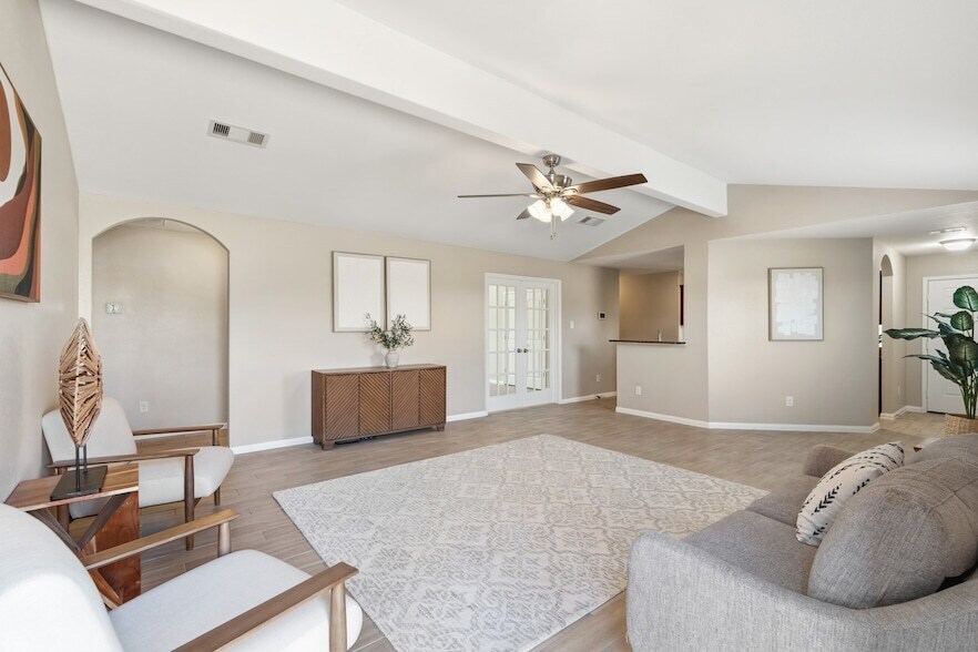 WATERFRONT VIEWS! Like new home with all tile floor throughout the home. Move in ready and pride of ownership shows. Home has an over-sized family room with access to the back yard from the primary bedroom and family rooms. Large laundry room and so much natural light in this home. Easy access to 99 and I-10 for commuting. This is a new neighborhood! Options are 3 large bedrooms with an office/study or 4 bedroom home with nice closets in all the rooms, 2 inc Faux Wood Blinds throughout, granite countertops and a large front yard with extra parking in the long driveway. Home is ready for immediate move in with approved application.