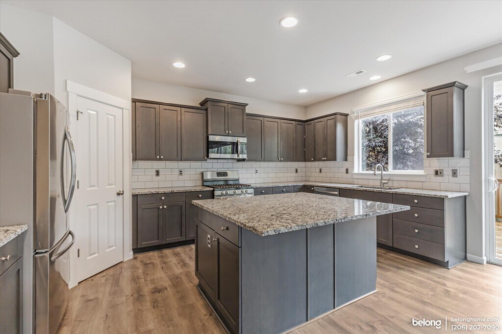 Come home to this brand-new, never-before-occupied 5-bedroom, 3-bathroom craftsman-style gem in the heart of Lake Stevens! Surrounded by a peaceful yet vibrant new community, this home offers the perfect balance of privacy and convenience. Step inside to find hardwood floors in the living room that exude warmth and charm. The spacious kitchen stands out with a generous center island, subway-tile backsplash, stainless steel appliances, and ample cabinetry. Whether you're hosting guests or enjoying a quiet morning, this kitchen delivers functionality with flair. Each of the five bedrooms is fully carpeted, creating a cozy atmosphere, while the spacious primary suite features a luxurious ensuite bathroom with a double-sink vanity, step-in shower, and a relaxing soaking tub, offering the ideal spot for unwinding at the end of the day. Up to two pets are welcome in this beautiful home, making it a great fit for the whole family. Practical conveniences include a laundry area and an attached 2-car garage with automatic door. Enjoy the perks of being minutes from Frontier Village for shopping, as well as the swimming beach and boat launch at Willard Wyatt Park. Commuters will appreciate the quick access to WA-2, WA-9, and I-5, making travel to major employers like Boeing and Providence Hospital a breeze. Located in the Lake Stevens School District and surrounded by recreational opportunities, this pristine home offers a fresh start and a fantastic lifestyle.