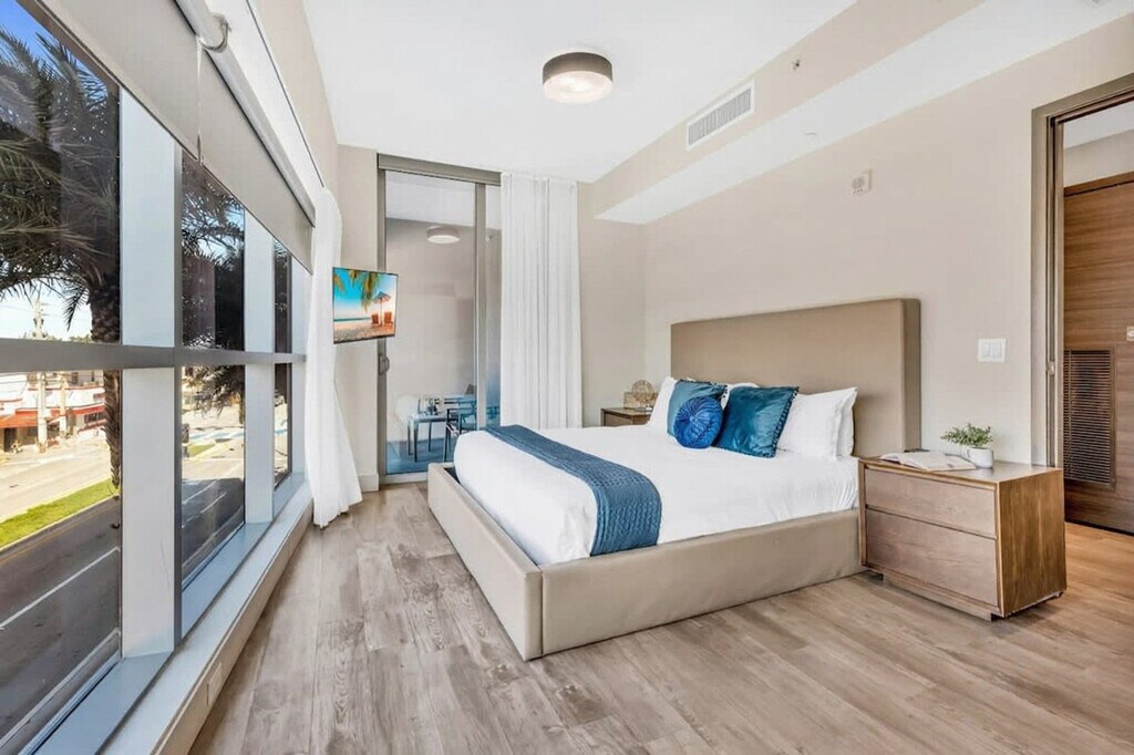 The advertised rate of $5,081/month is the lowest available price, based on a 30 day(s) stay with a move-in date of August 23, 2026. Rates vary depending on the duration of stay, season, and other parameters. For exact pricing and additional pricing components, please visit our website and enter your desired move-in and move-out dates. The rate is applicable when billed upfront; it can be higher if billed in multiple payments. Feel at home in this brand new apartment steps from the Hollywood Broadwalk, overlooking a beautiful beach surrounded by bars, live music, and wonderful restaurants. This condo resort features a rooftop pool, hot tub, gym, and sun deck. The apartment has a master bedroom with a king-size bed, a second bedroom with a queen-size bed, two bathrooms, a living room with 1 full pullout sofa bed, and a balcony with bay views. This well-designed apartment mixes natural wood and stone with organic textures, along with state-of-the-art technology. The fully equipped gourmet kitchen offers a stainless steel refrigerator/freezer, a glass stove, an integrated oven, a silent dishwasher, an integrated microwave, a stove, dishes, a coffee maker, and a toaster. The spacious bedroom includes a hairdryer, an electronic safe, an iron/ironing board, and TVs. The apartment is fully furnished with ceramic floors, electronic door locks, European-style cabinetry, and modern-style designer fixtures and faucets. A pack and play crib is available upon request. One pet per unit is welcome for free, but fees may apply for additional pets, and the apartment has a 25 lbs restriction (doesn’t apply to ESA). Parking is available at the condo for $42 a day, or a public parking pass can be issued for the whole month for $110 plus taxes, which allows parking on any street or city parking lot (300 Connecticut St). Located along North Ocean Drive in the lively community of Hollywood Beach, this apartment puts travelers at the heart of the action. Within walking distance of the famous Hollywood Beach Broadwalk and the beach, guests can enjoy exciting activities such as jet skiing, fishing, sailing, biking, and golf. South Beach and Miami are a short drive away. The Broadwalk has bars, restaurants, boutiques, and shops. Check-in is any time after 4PM, and check-out is any time before 11AM. Swimming is at your own risk, as there is no lifeguard on duty. Children must be supervised by a responsible adult at all times. Keep all doors closed and the air conditioning on at all times to help prevent condensation and property damage. The public beach and Broadwalk within the City of Hollywood Beach does not allow pets (service animals are still welcome!). [SI]