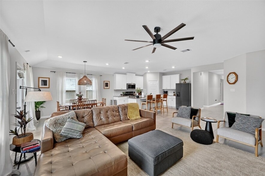 Step into comfort and style with this charming 4-bedroom, 3-bathroom home in the desirable Central Park community! Offering a perfect balance of modern features and everyday functionality, this home is designed to impress. The chef-inspired kitchen showcases granite countertops, stainless steel appliances, and a spacious island ideal for daily living and entertaining alike. The open-concept family room invites you to relax or gather with loved ones, with plenty of room for making memories. The private primary suite serves as your personal retreat, complete with a spa-like bath featuring a garden tub, separate shower, dual vanities, and generous walk-in closets. Step outside to enjoy the covered back patio perfect for unwinding at the end of the day or hosting weekend gatherings. You'll enjoy a welcoming atmosphere and close-knit community feel.