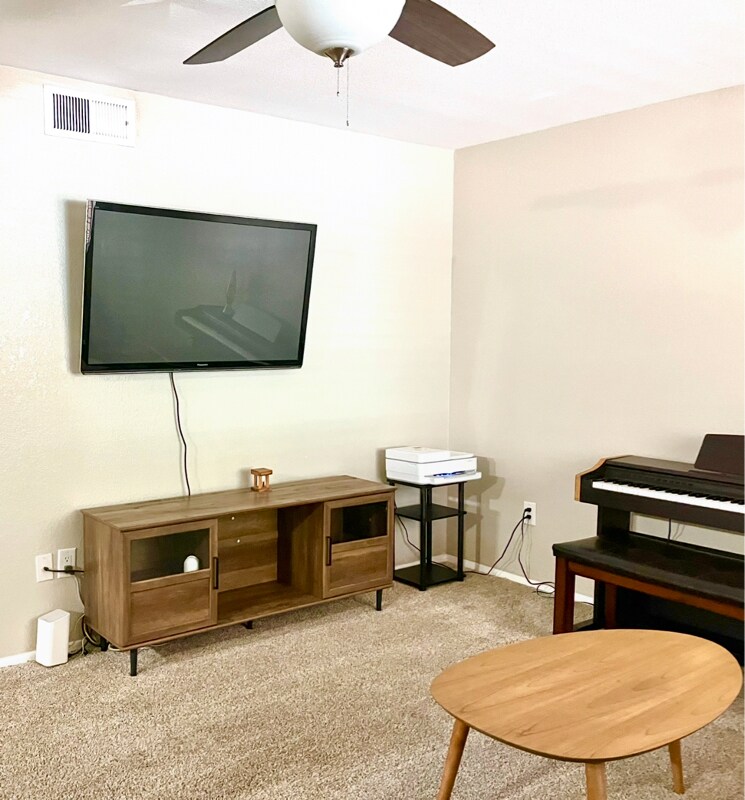 Property Id: 2146587 Short-term lease available. First month 50% off with 1-year lease. Fully furnished 2 bed, 2 bath ground-floor unit near ASU. Primary bedroom has attached full bath and mirrored closet. Second bedroom includes LED strip lighting. Each bedroom comes with a twin bed, bedding, nightstand, lamp, desk, chair, towels, and laundry organizer. Living room includes TV and entertainment center. Kitchen equipped with pots, pans, dishes, microwave, refrigerator, stove, oven, and dishwasher. Dining counter with two chairs. Shared stacked washer/dryer in unit. Community gym and pool. Bike stand and mailbox. Excellent location: 0.2 miles to Barrett Honors College, 0.7 miles to ASU campus, 1 mile to ASU Science Building. Tenants pay utilities. $500 non-refundable cleaning fee. $1,800 refundable security deposit. Credit/background check required. Small dog considered with approval and pet fee. No smoking. No parties. Photos are from different settings and different times.