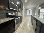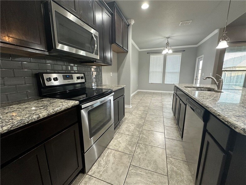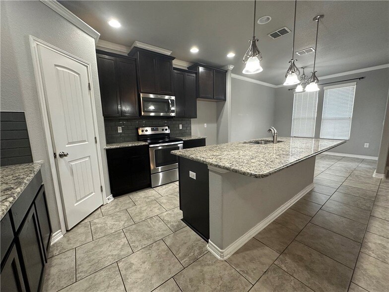 Explore this four-bedroom house located in a desirable neighborhood. The home, adorned with cobblestone and brick, awaits your arrival. Step through the grand entrance into a spacious open-concept living space. The kitchen, ideal for crafting home-cooked meals, features black and stainless steel appliances, including a stove/oven combination, dishwasher, and built-in microwave. A large pantry and an island with a breakfast bar and elegant pendant lighting add to its charm. The living and dining areas offer backyard and covered patio views, enhanced by natural light. The split floor plan affords privacy to the primary suite situated at the rear of the house, equipped with a dual vanity, garden tub, and glass-enclosed shower for ultimate relaxation. The suite's walk-in closet provides direct access to the laundry room, adding convenience. Three more bedrooms and a full bathroom serve additional occupants, and a drop zone helps keep everyday items neatly organized.